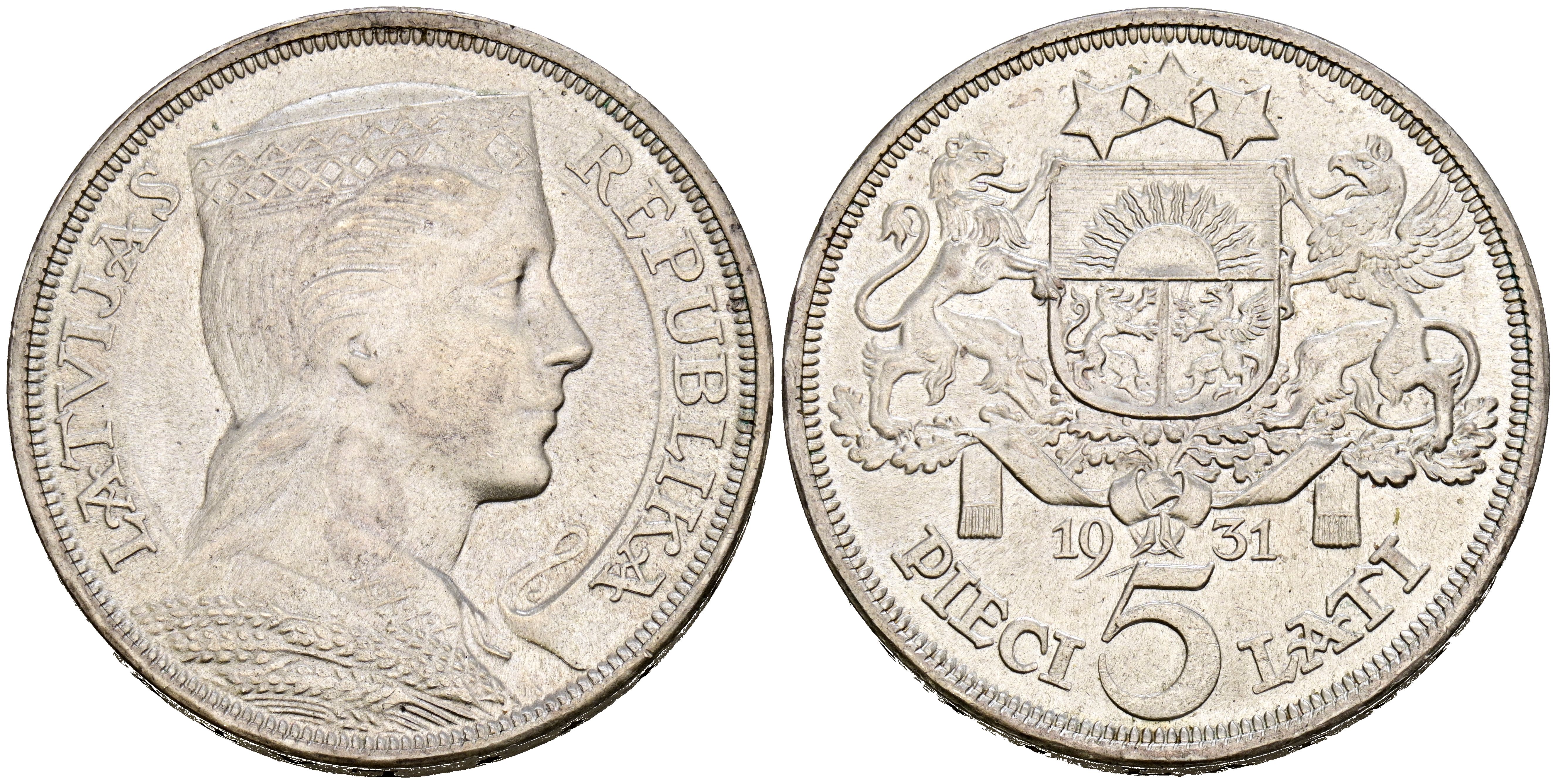 LETONIA, Primera República (1918-1940). 5 Lati. (Ar. 25,04g /37mm). 1931. (Km#9). EBC+. Magnífico ejemplar.
