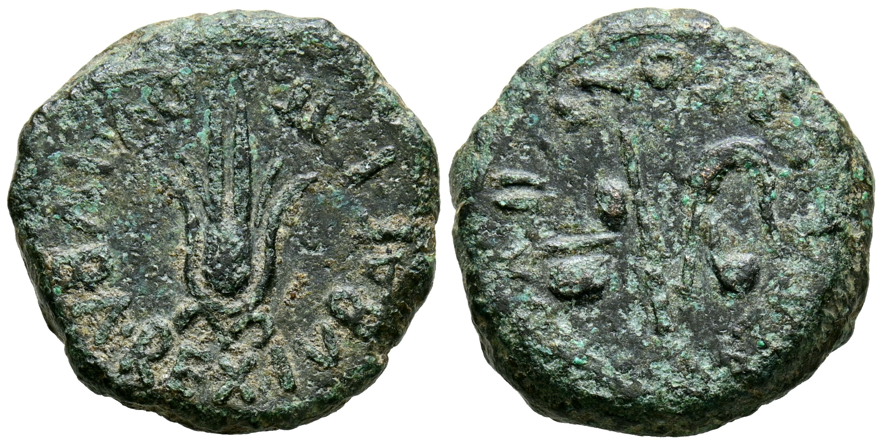 CARTAGONOVA (Cartagena, Murcia). Semis. (Ae. 7,12g/20mm). 27 a.C.-14 d.C. (FAB-585). Anv: Flor de loto, alrededor leyenda: IVBA REX IVBAE F II VIR QV. Rev: Atributos sacerdotales, alrededor leyenda: CN ATELIVS PONTI II V Q. MBC-.
