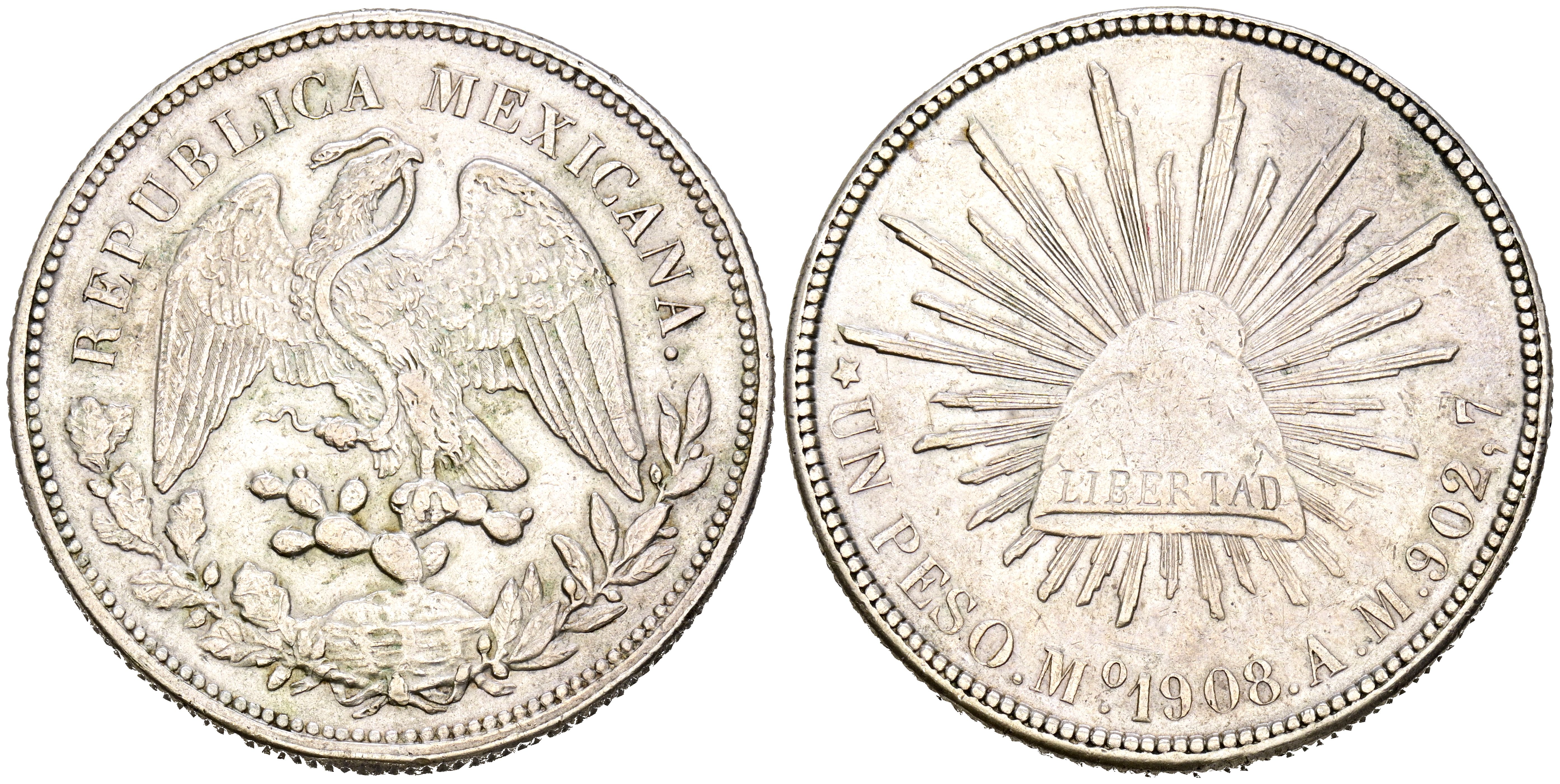 MÉXICO. 1 Peso. (Ar. 26,95g/39mm). 1908. México AM. (Km#409.2). MBC+. Escasa así.
