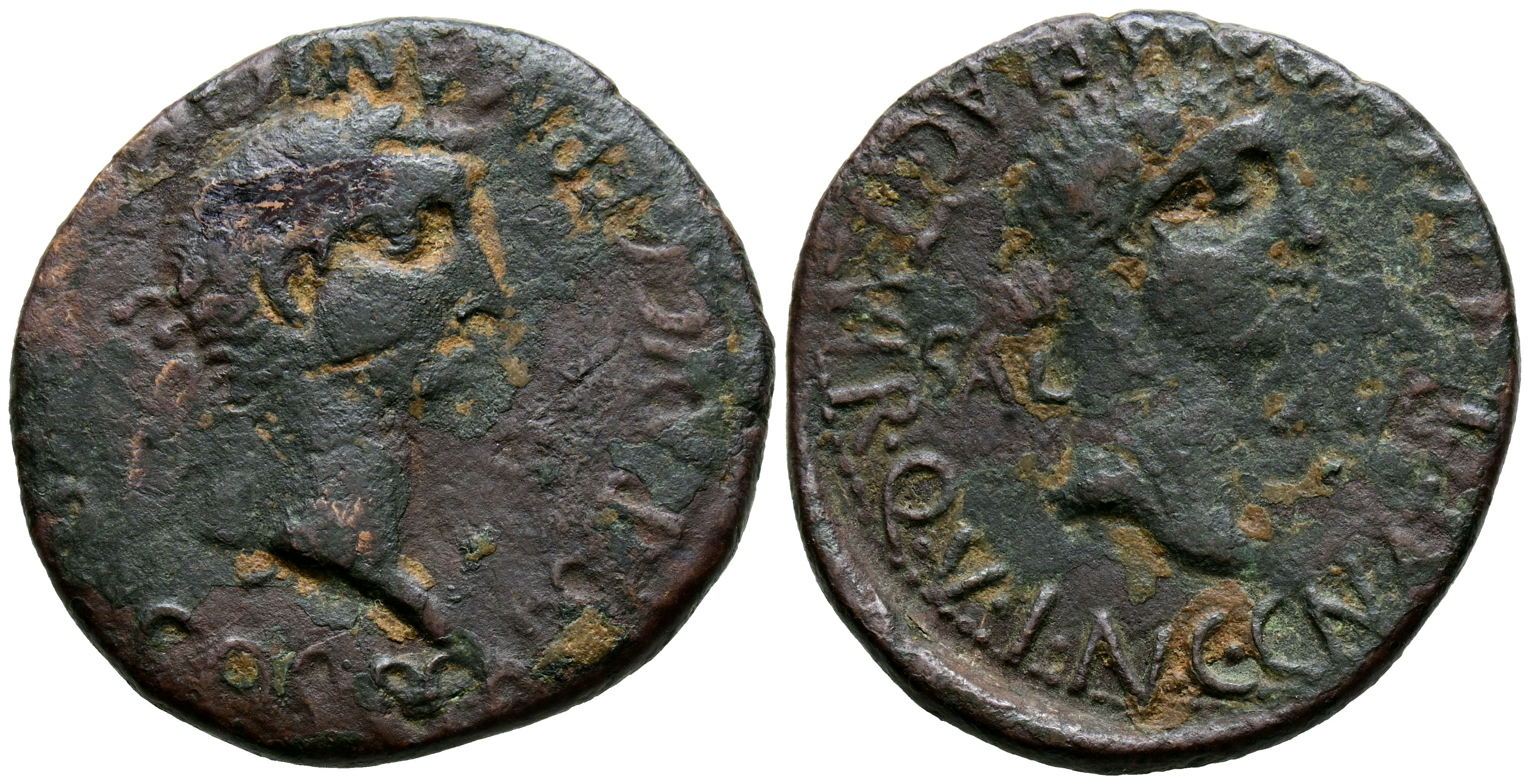 CARTAGONOVA (Cartagena, Murcia). As. (Ae. 11,04/28mm). 37-41 d.C. (FAB-613). Anv: Cabeza de Calígula laureada a derecha, alrededor leyenda: C CAESAR AVG GERMANICA IMP P M TR P COS. Rev: Cabeza laureada de Cesonia, a los lados: SAL-AVG, alrededor leyenda: CN ATEL FLAC CN POM FLAC II VIR. BC+/MBC-.