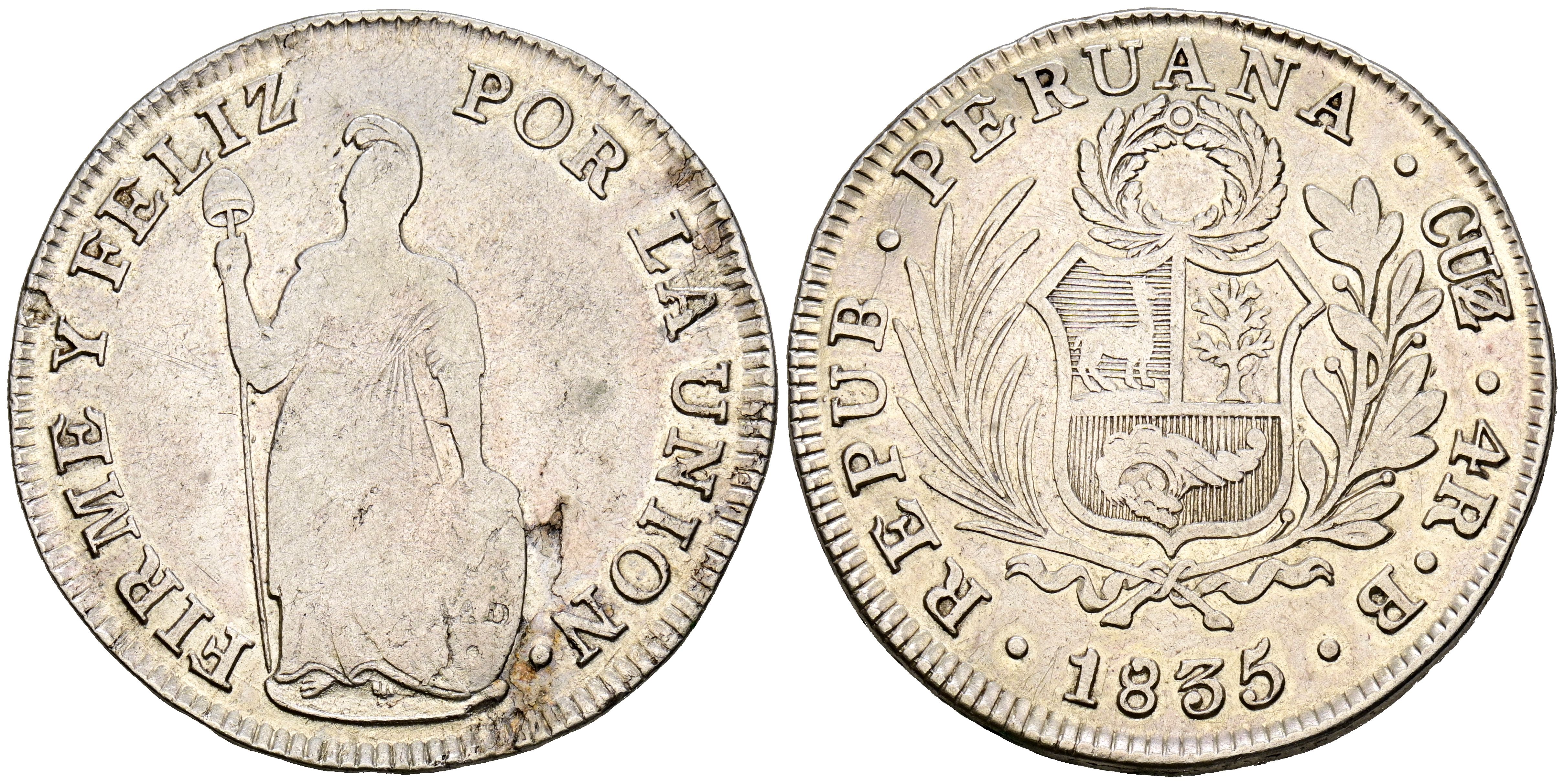 PERÚ. 4 Reales (Ar. 13,33g/34mm). 1835. Cuzco. (Km#151.1). MBC/MBC+.