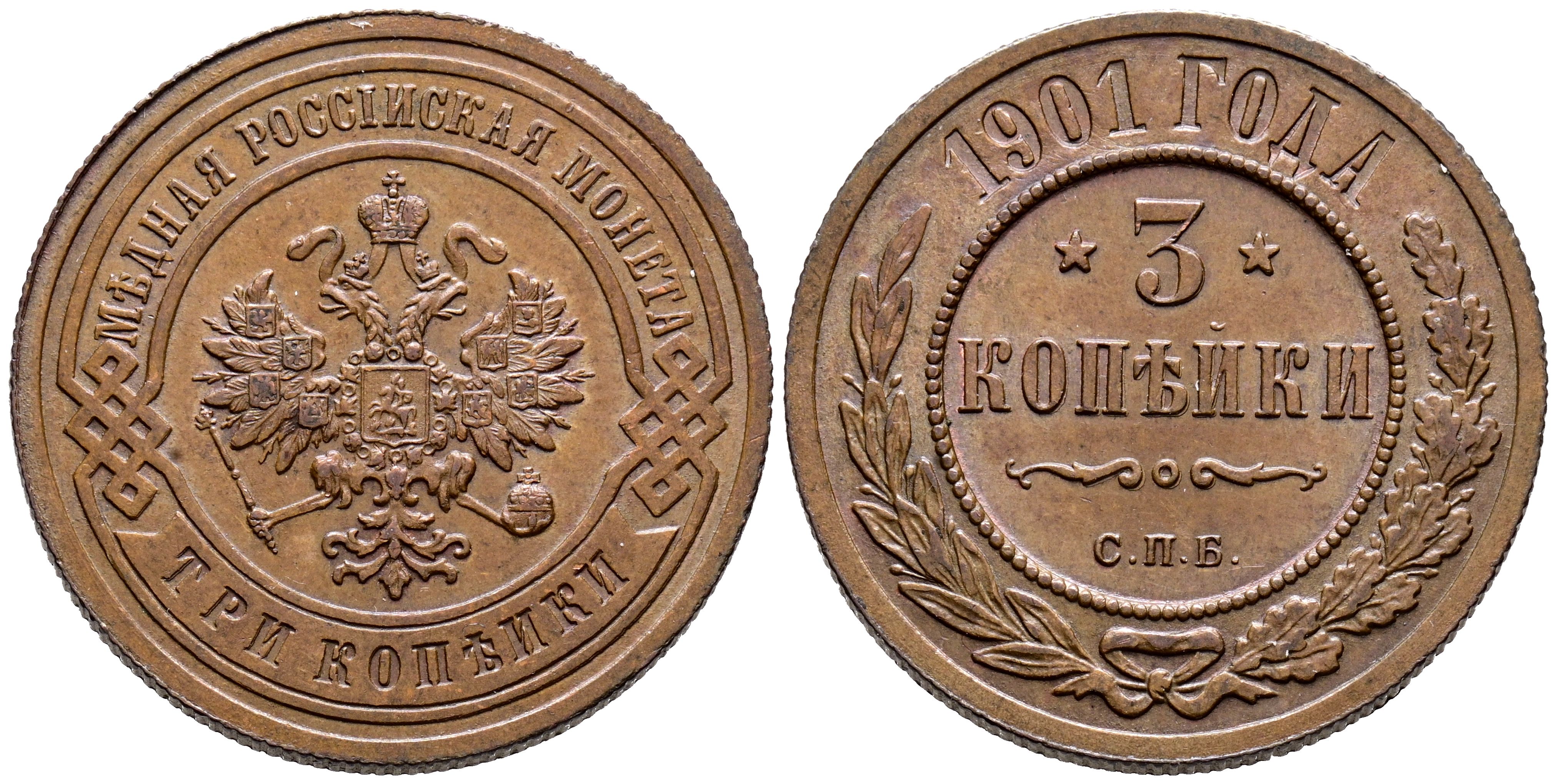 RUSIA, Nicolás II. 3 Kopeks. (Ae. 9,87g/28mm). 1901. (Km#11). EBC. Escasa así.
