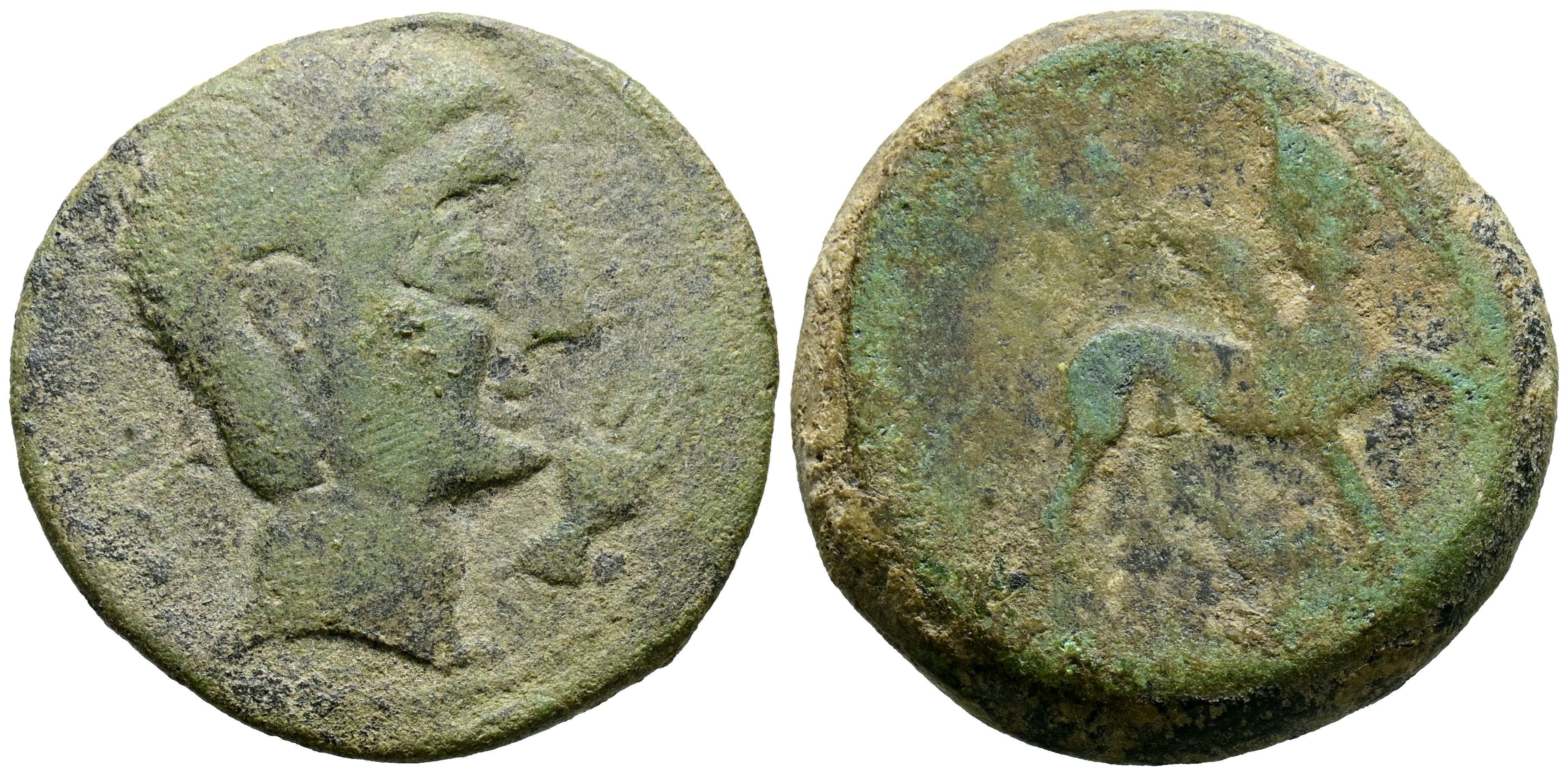 CASTULO (Cazlona, Jaén). As. (Ae. 12,78g/27mm). 180 a.C. (FAB-700). Anv: Cabeza masculina diademada a derecha, mano al frente. Rev: Esfinge a derecha, debajo leyenda ibérica: CaSTeLE. MBC-/BC-.