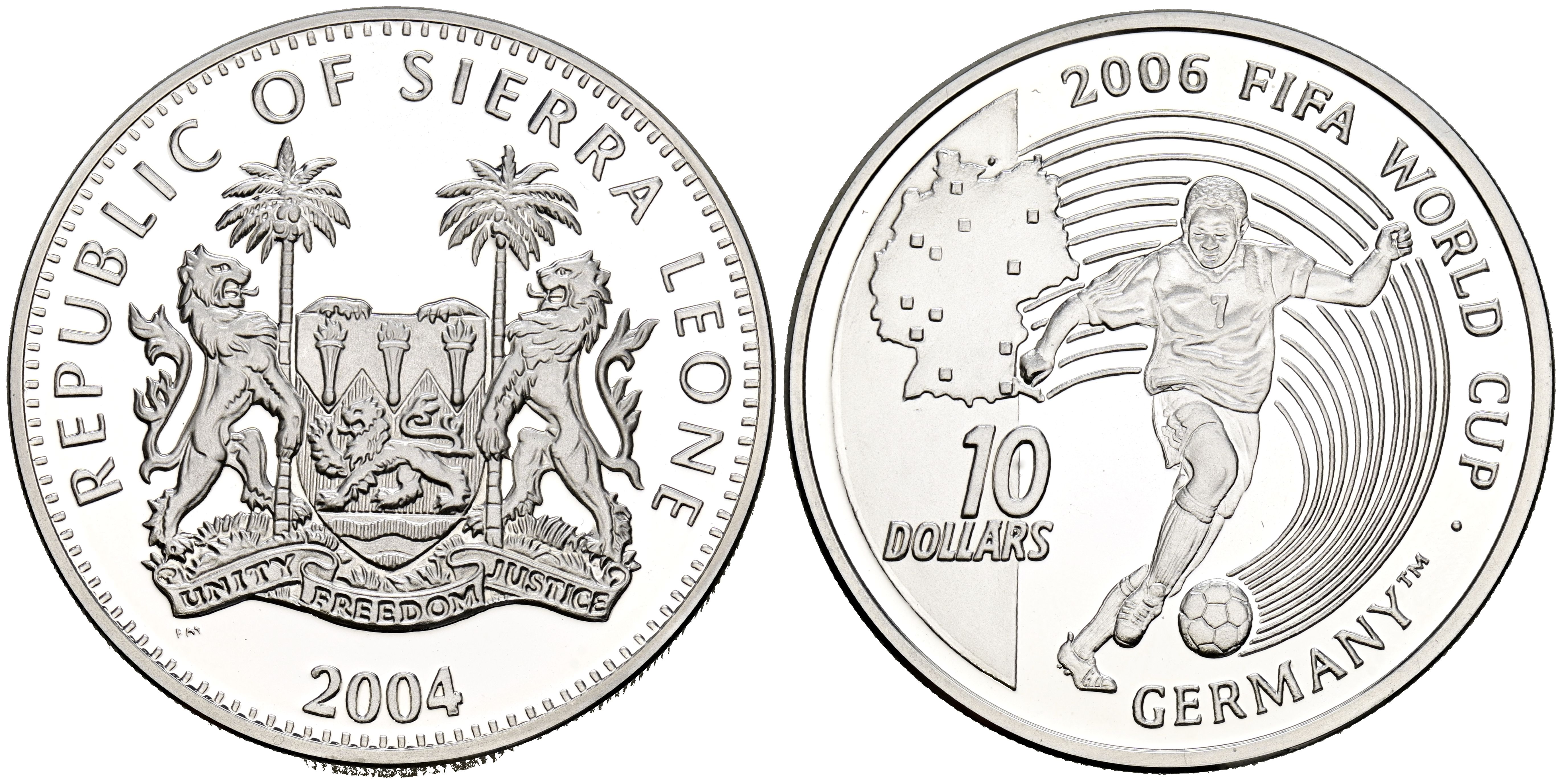 SIERRA LEONA. 10 Dollars. (Ar. 28,52g/38mm). 2004. Mundial de Fútbol de Alemania 2006. (Km#200). PROOF.