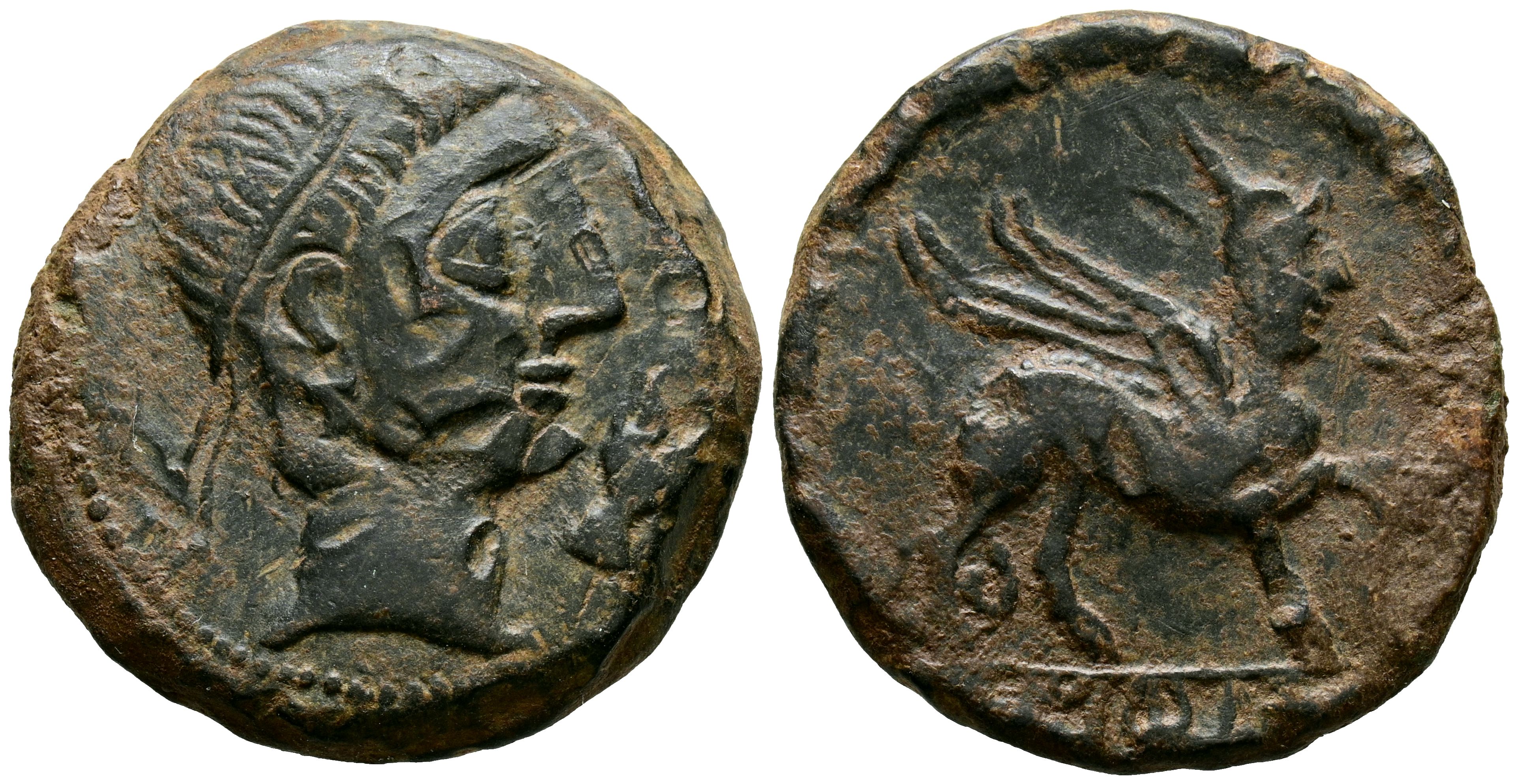 CASTULO (Cazlona, Jaén). As. (Ae. 13,95g/27mm). 180 a.C. (FAB-701). Anv: Cabeza masculina diademada a derecha, delante mano. Rev: Esfinge a derecha, delante estrella, debajo leyenda ibérica: CaSTeLE. MBC+.