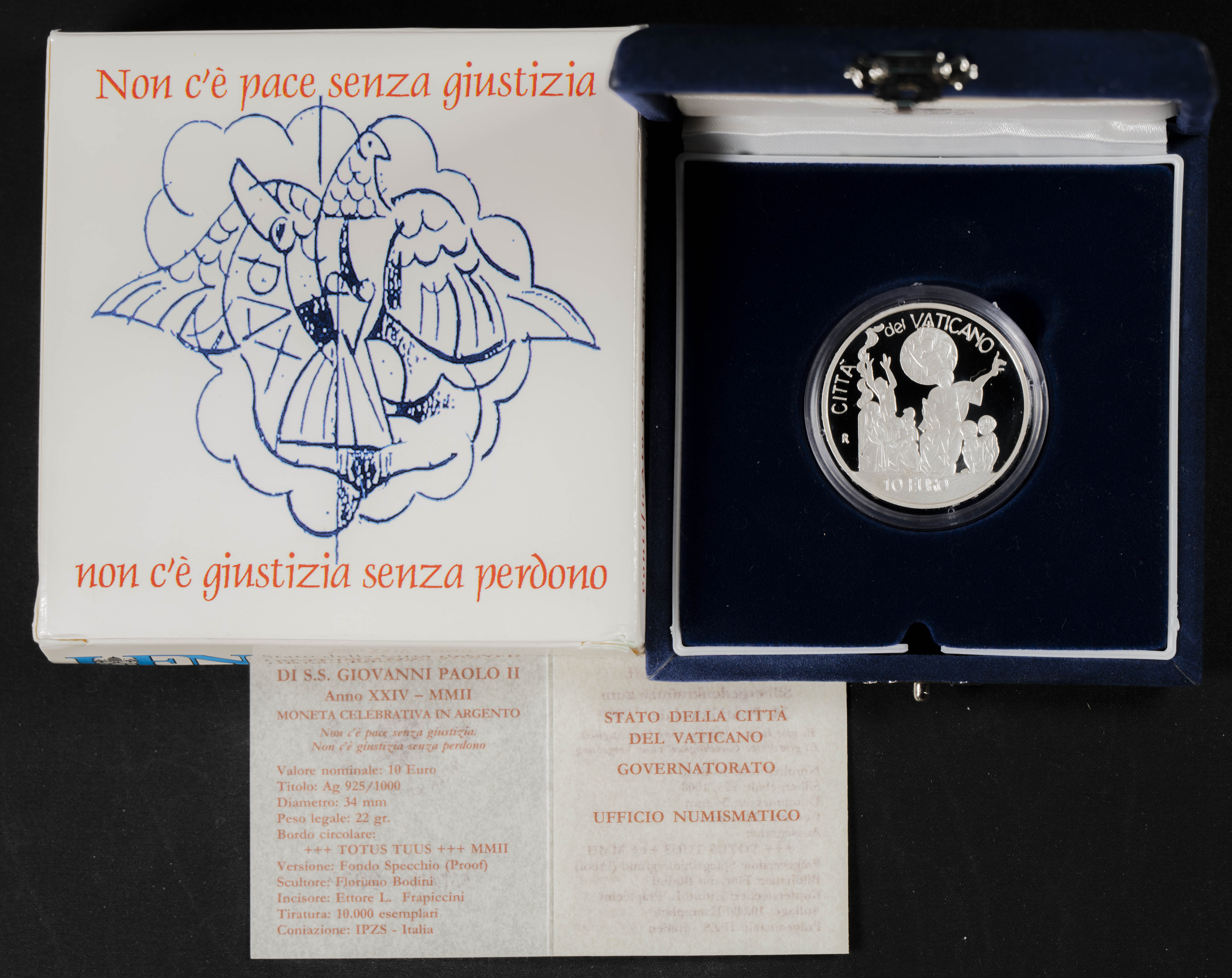 VATICANO. 10 Euros. (Ar. 22,00g/34mm). 2002. Juan Pablo II. Jornada Mundial de la Paz. (Km#350). PROOF. Incluye estuche y certificado de autenticidad.