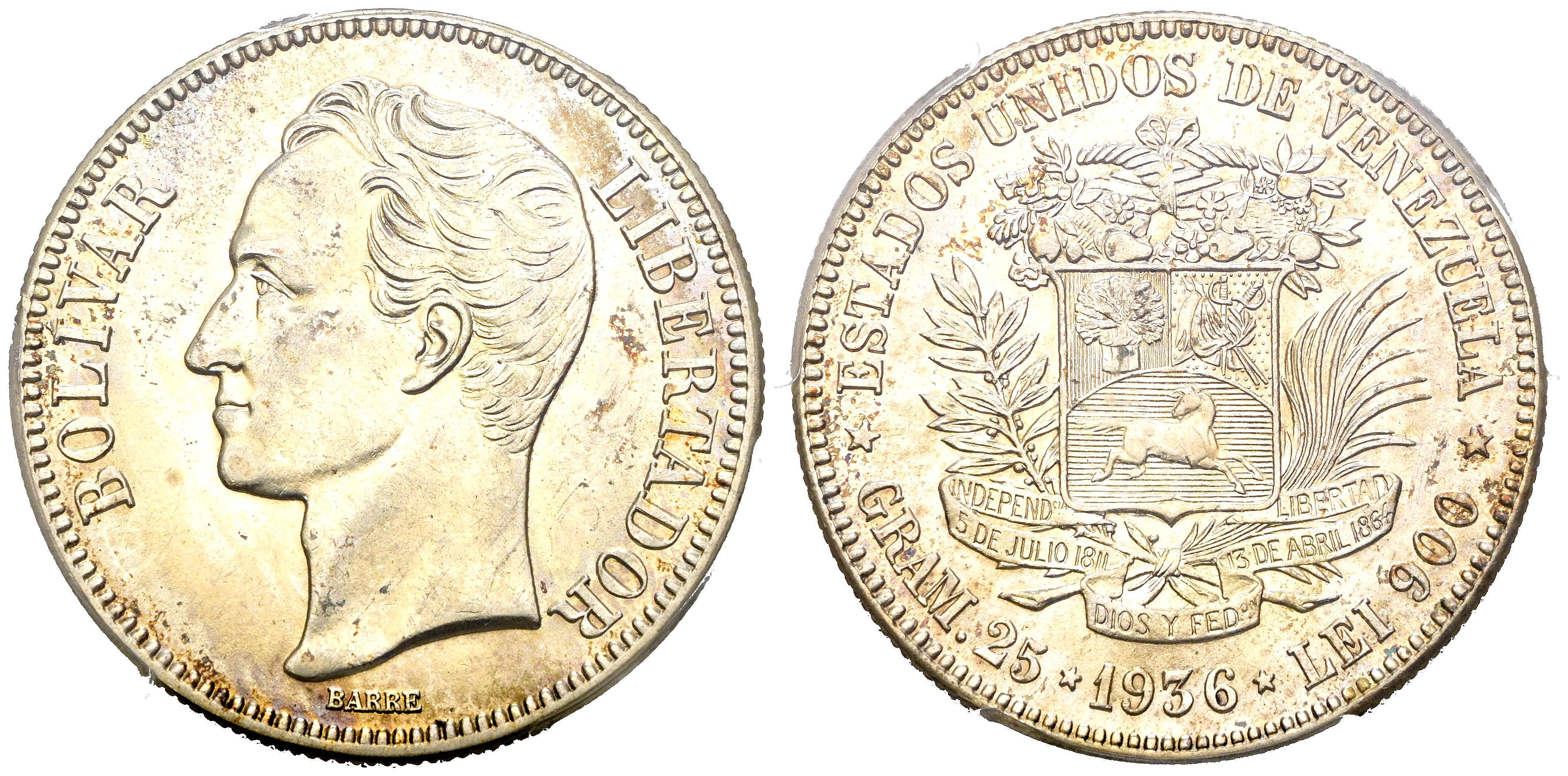 VENEZUELA. 5 Bolívares. (Ar. 25,00g/37mm)*. 1936. Philadelphia. (Km#24.2). Encapsulada por PCGS AU 58. *Peso y medidas teóricos.