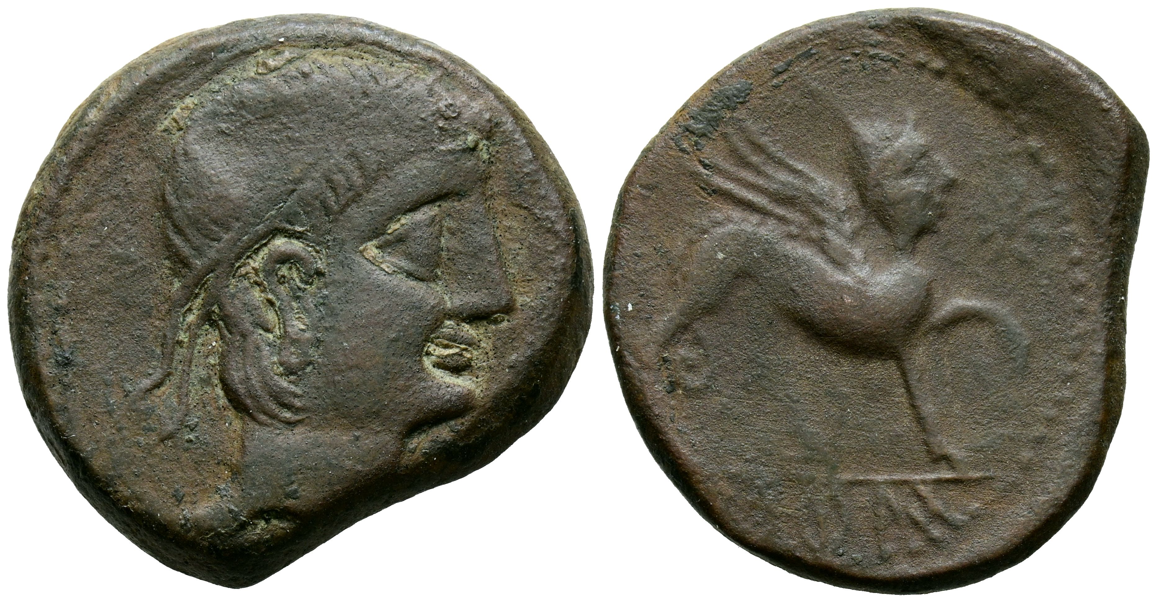 CASTULO (Cazlona, Jaén). As. (Ae. 13,94g/27mm). 180 a.C. (FAB-701). Anv: Cabeza masculina diademada a derecha, mano al frente. Rev: Esfinge a derecha, delante estrella, debajo leyenda ibérica: CaSTeLE. MBC. Limpiada.