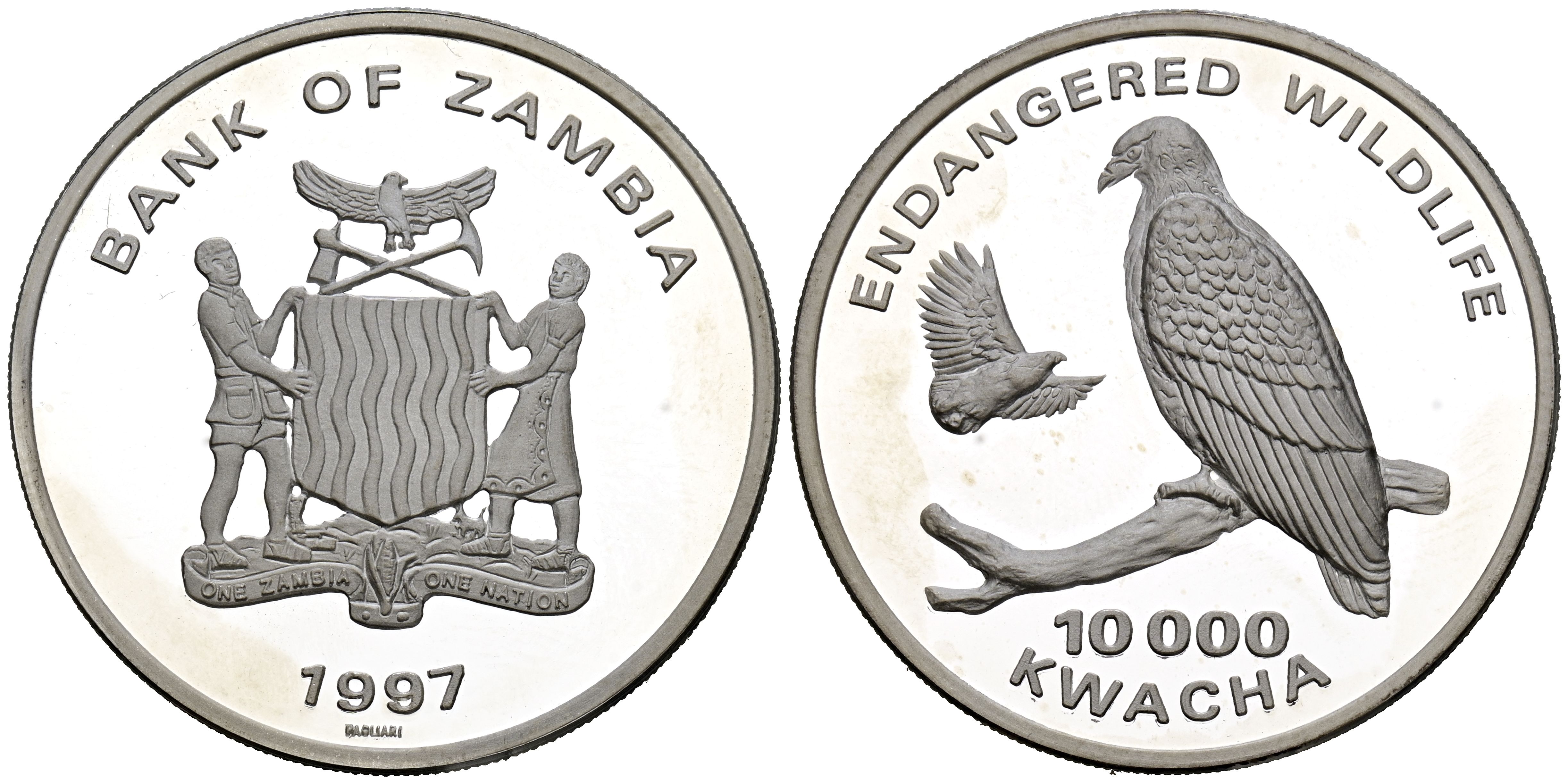 ZAMBIA. 10.000 Kwacha. (Ar. 30,42g/34mm). 1997. Serie Fauna en peligro de extinción. (Km#86). PROOF. Muy escasa.