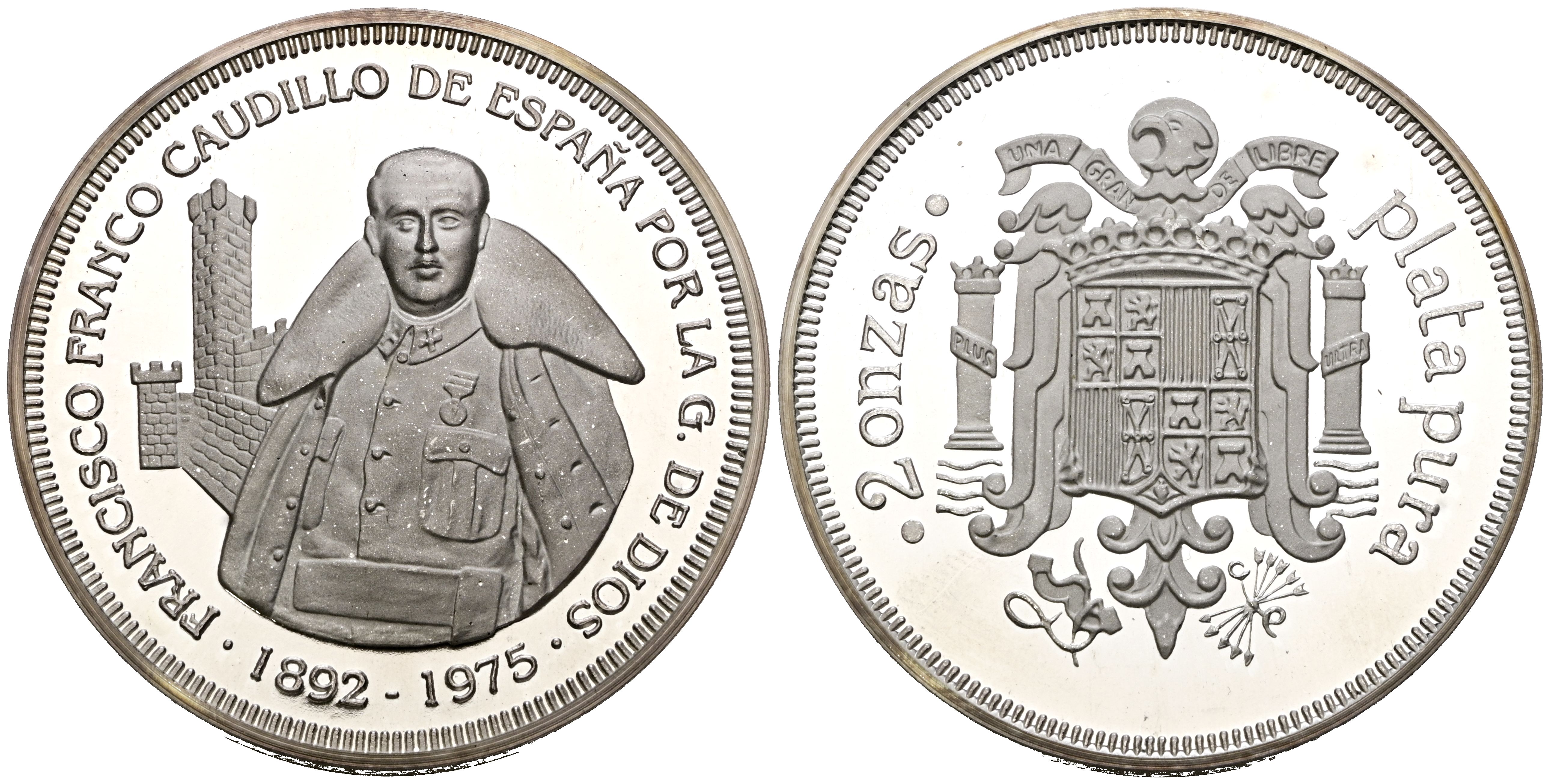 ESTADO ESPAÑOL. 2 Onzas. (Ar. 62,15g/47mm). F. Franco 1892-1975. Plata pura. PROOF
