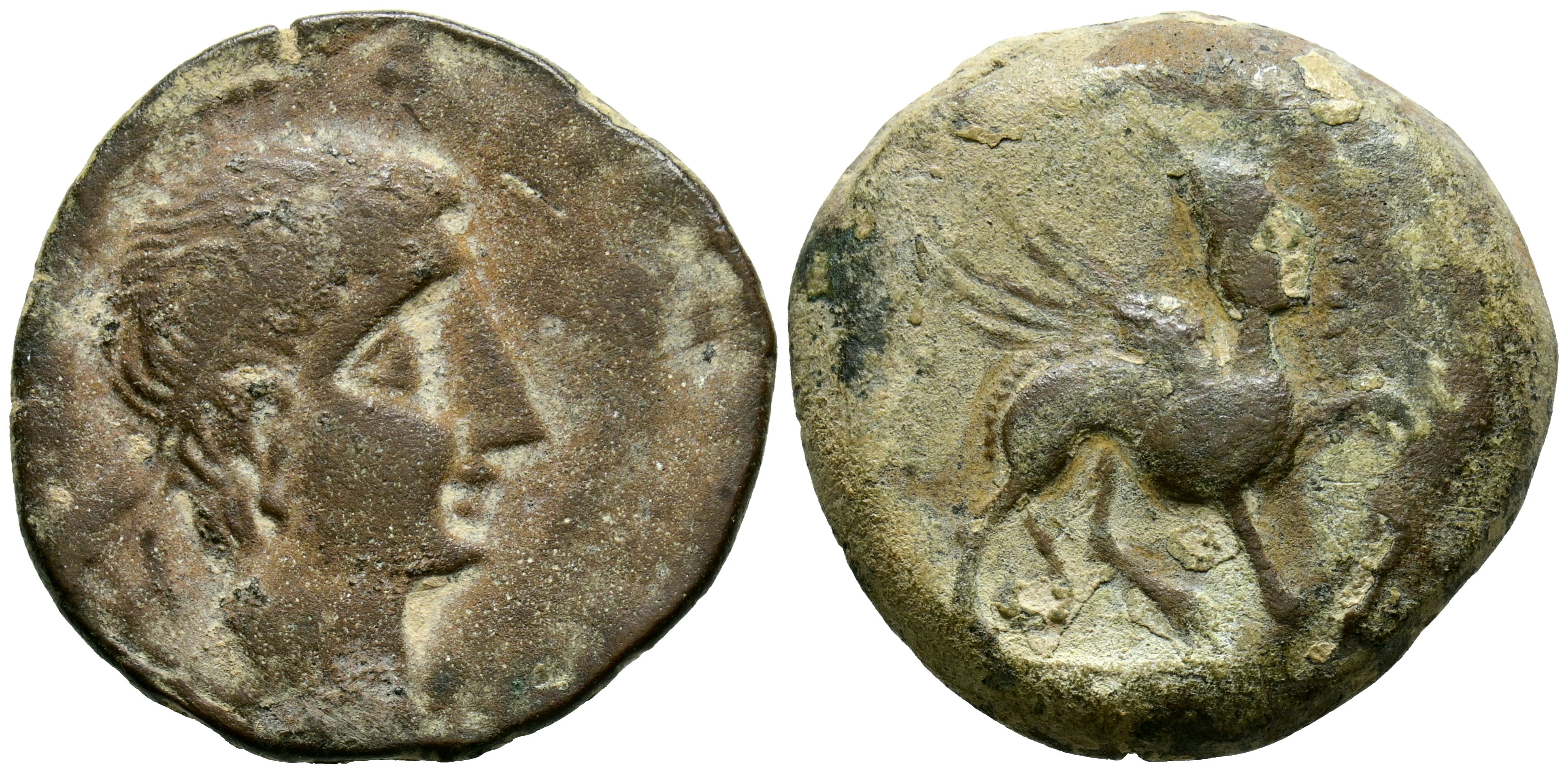 CASTULO (Cazlona, Jaén). As. (Ae. 15,34g/27mm). 180 a.C. (FAB-701). Anv: Cabeza masculina diademada a derecha, mano al frente. Rev: Esfinge a derecha, delante estrella, debajo leyenda ibérica: CaSTeLE. MBC-. Limpiada.