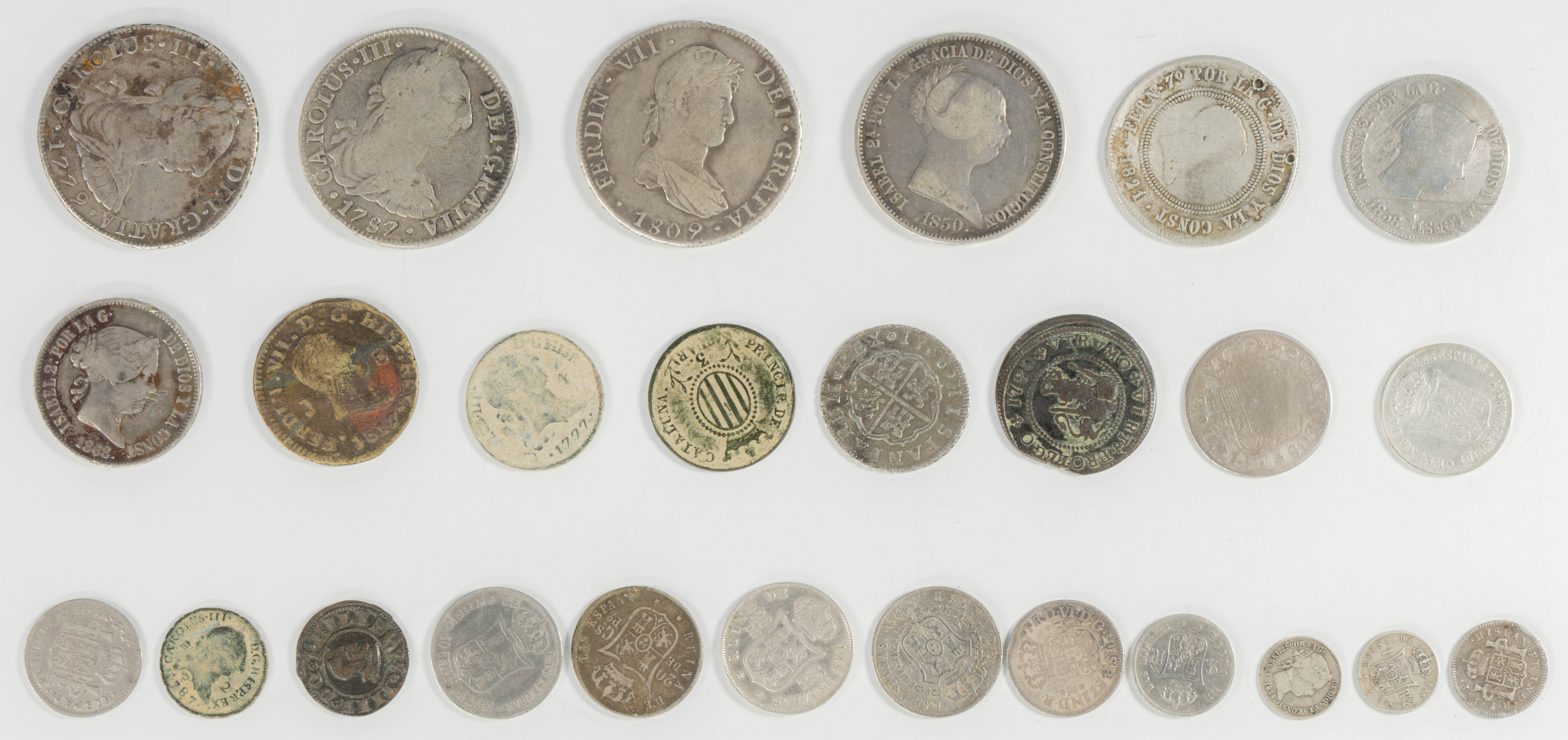 MONARQUÍA ESPAÑOLA. Interesante conjunto de 26 piezas, mayoritariamente en plata, con acuñaciones en diferentes periodos y módulos, incluido los 8 Reales. Diferentes estados de conservación. A EXAMINAR.
