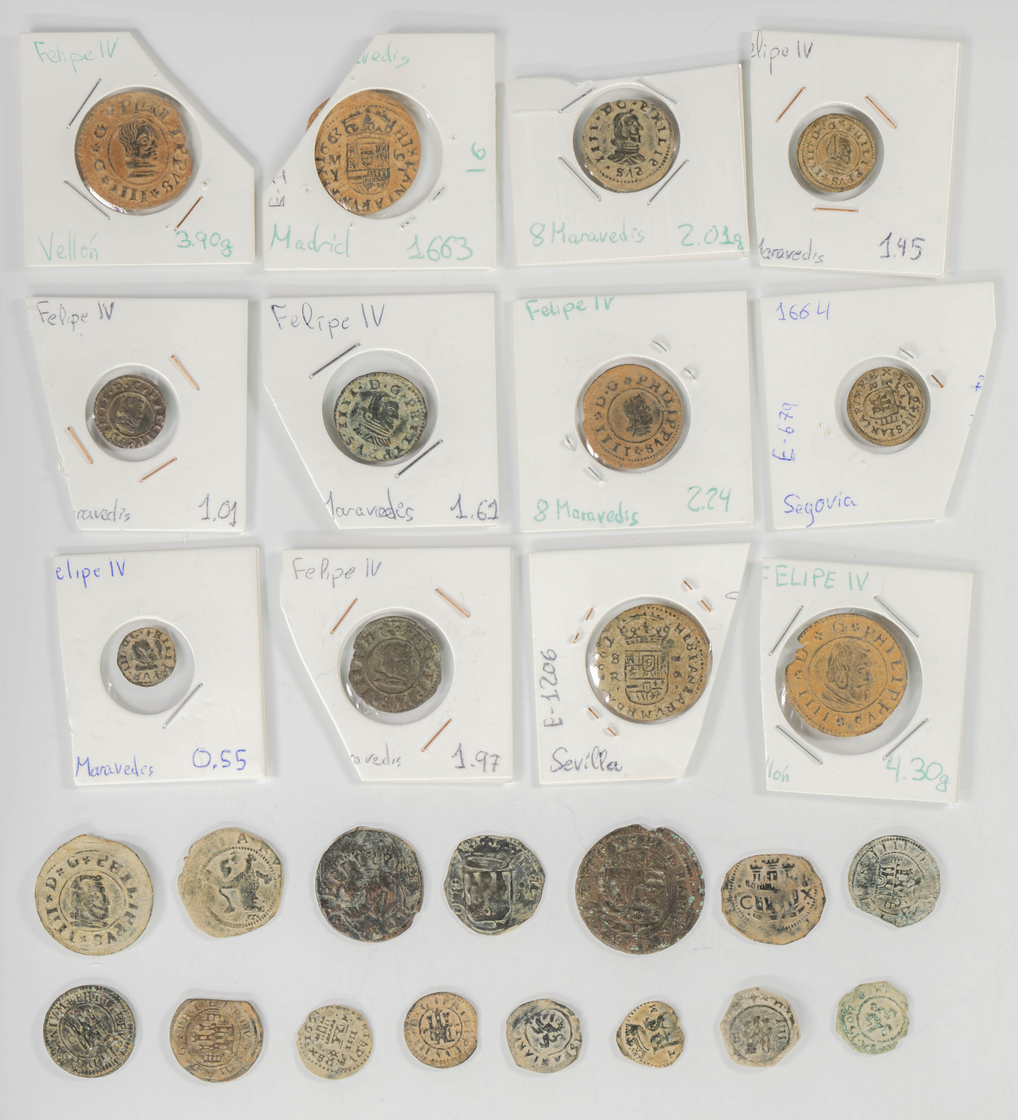 MONARQUIA ESPAÑOLA. Interesante conjunto formado por 28 cobres, en su inmensa mayoría, Maravedís de Felipe III y Felipe IV, así como alguna pieza de los Reyes Catolicos. Incluye un cuartillo de Valladolid. Diferentes módulos, cecas, pesos y estados de conservación. A EXAMINAR.