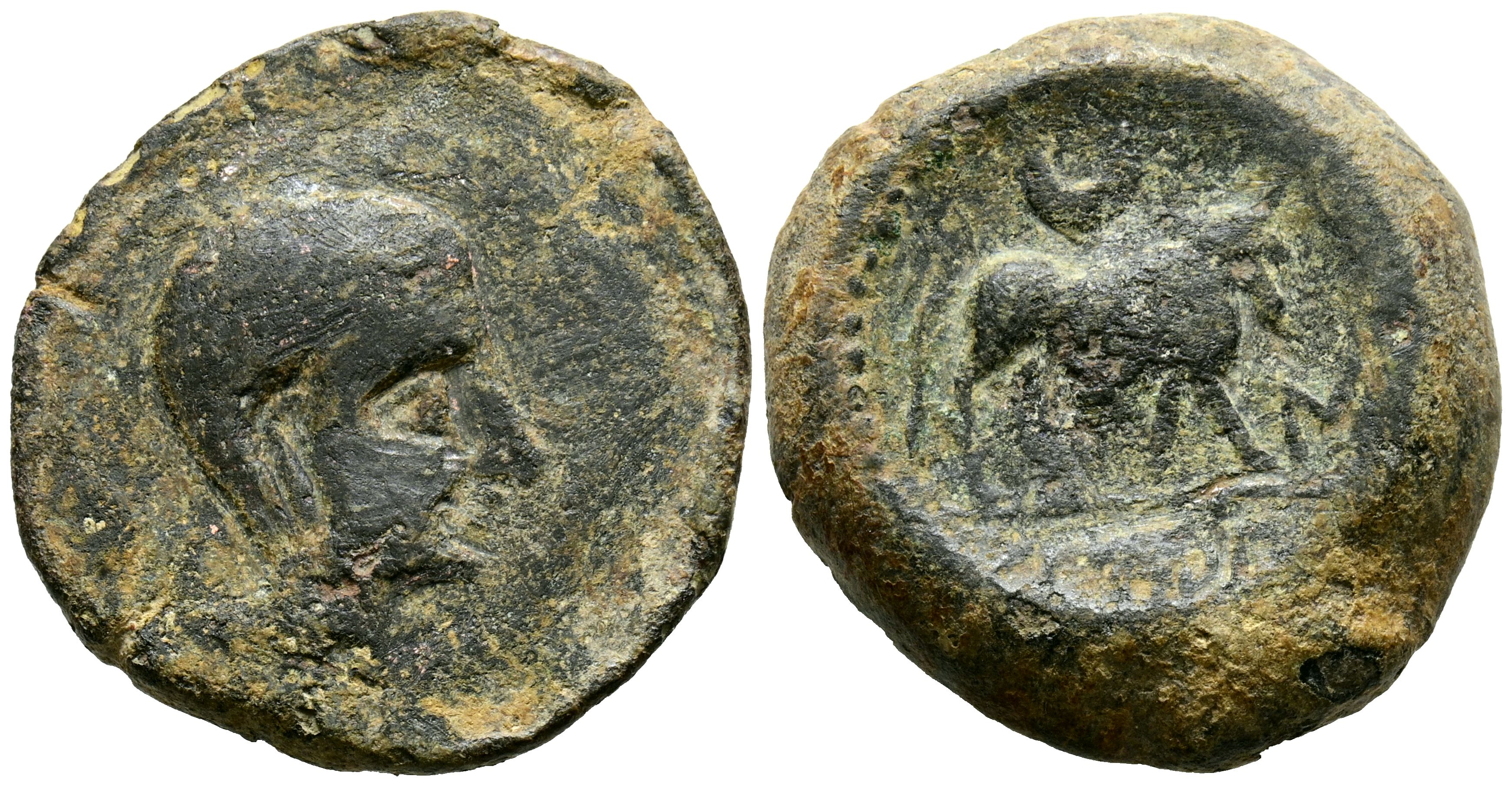 CASTULO (Cazlona, Jaén). Semis. (Ae. 12,62g/25mm). 180 a.C. (FAB-715). Anv: Cabeza masculina con diadema a la derecha, delante S. Rev: Toro a la derecha, encima creciente, antes de la letra ibérica Co, en exergo leyenda ibérica: CaSTeLE. MBC.