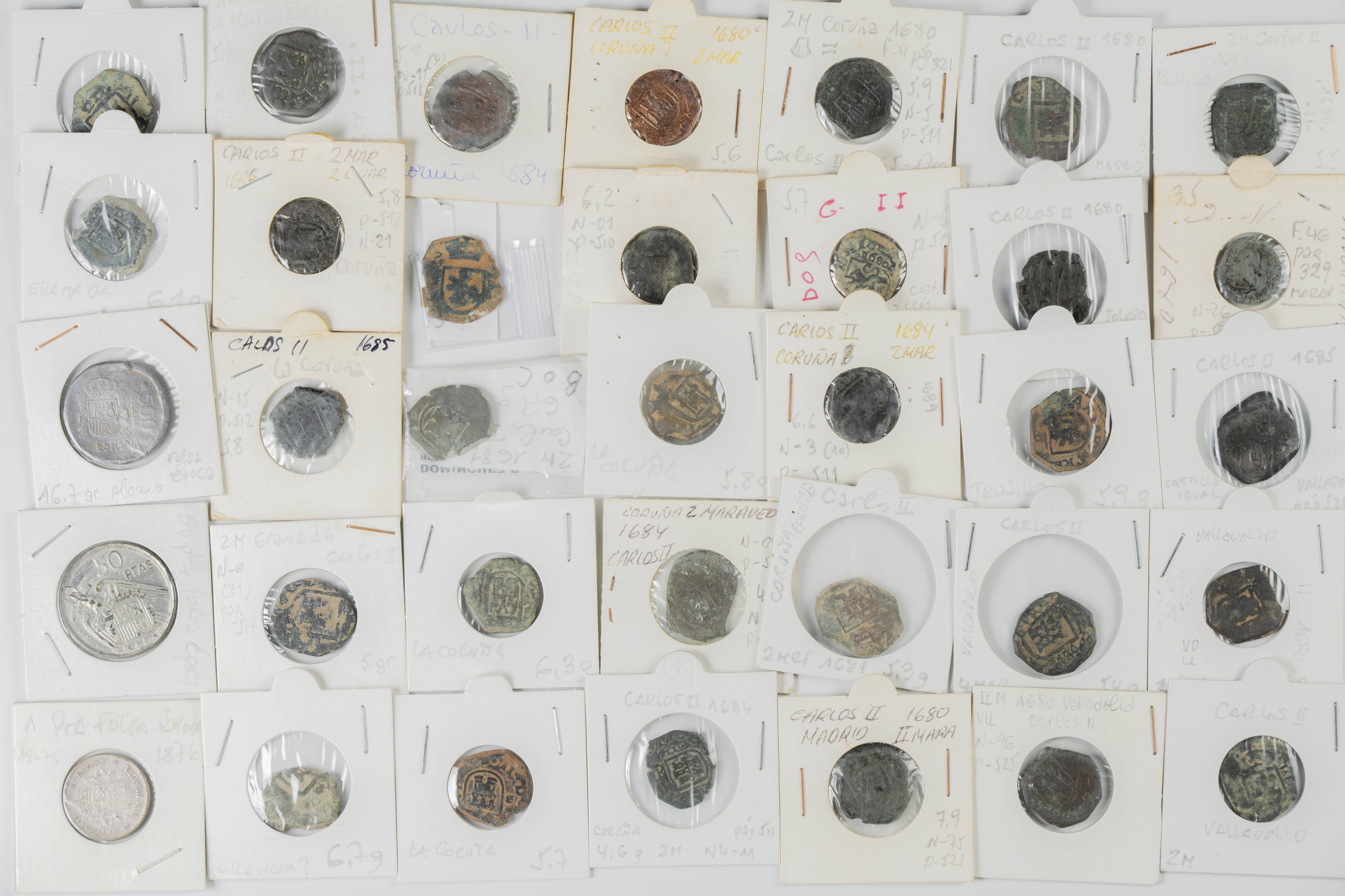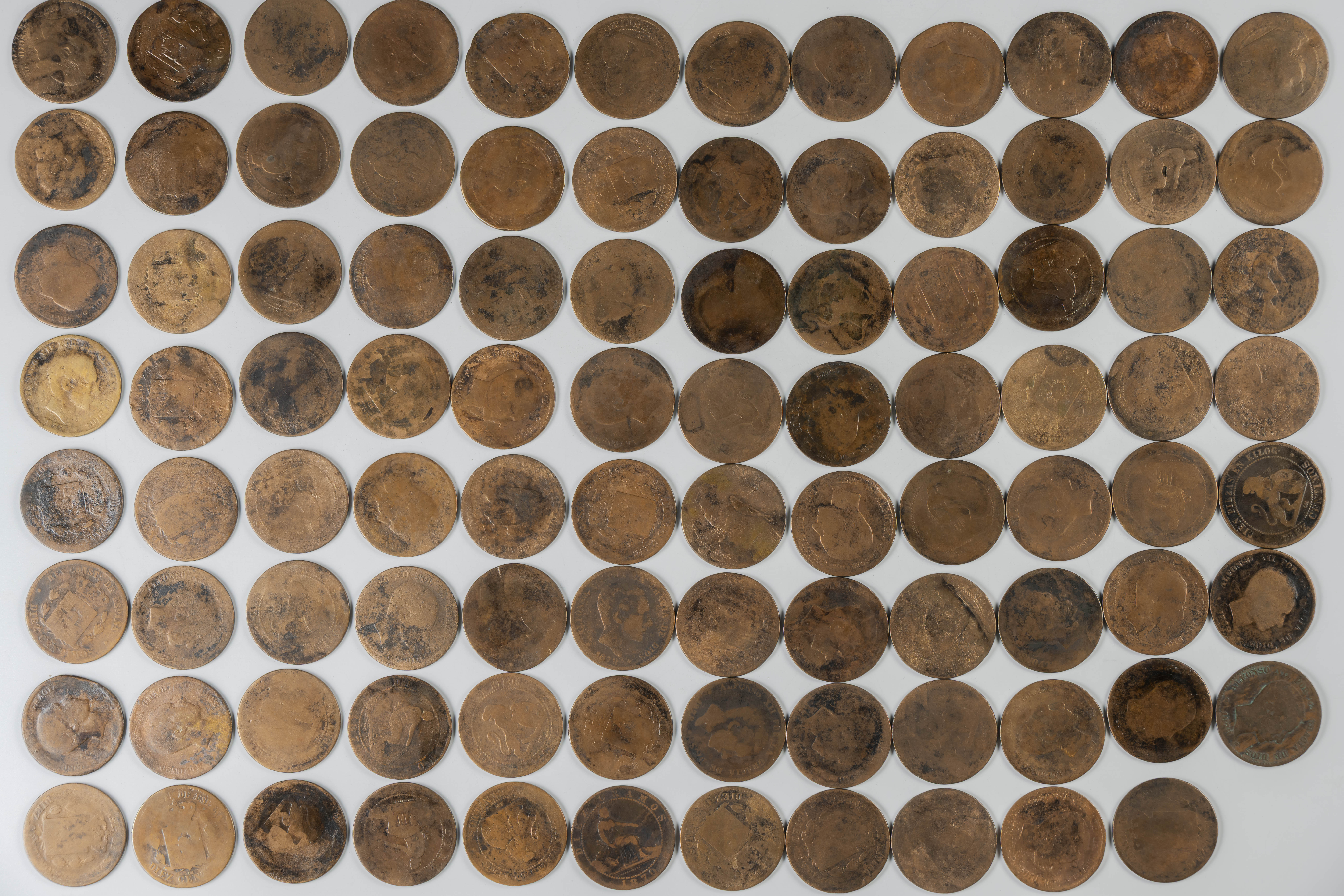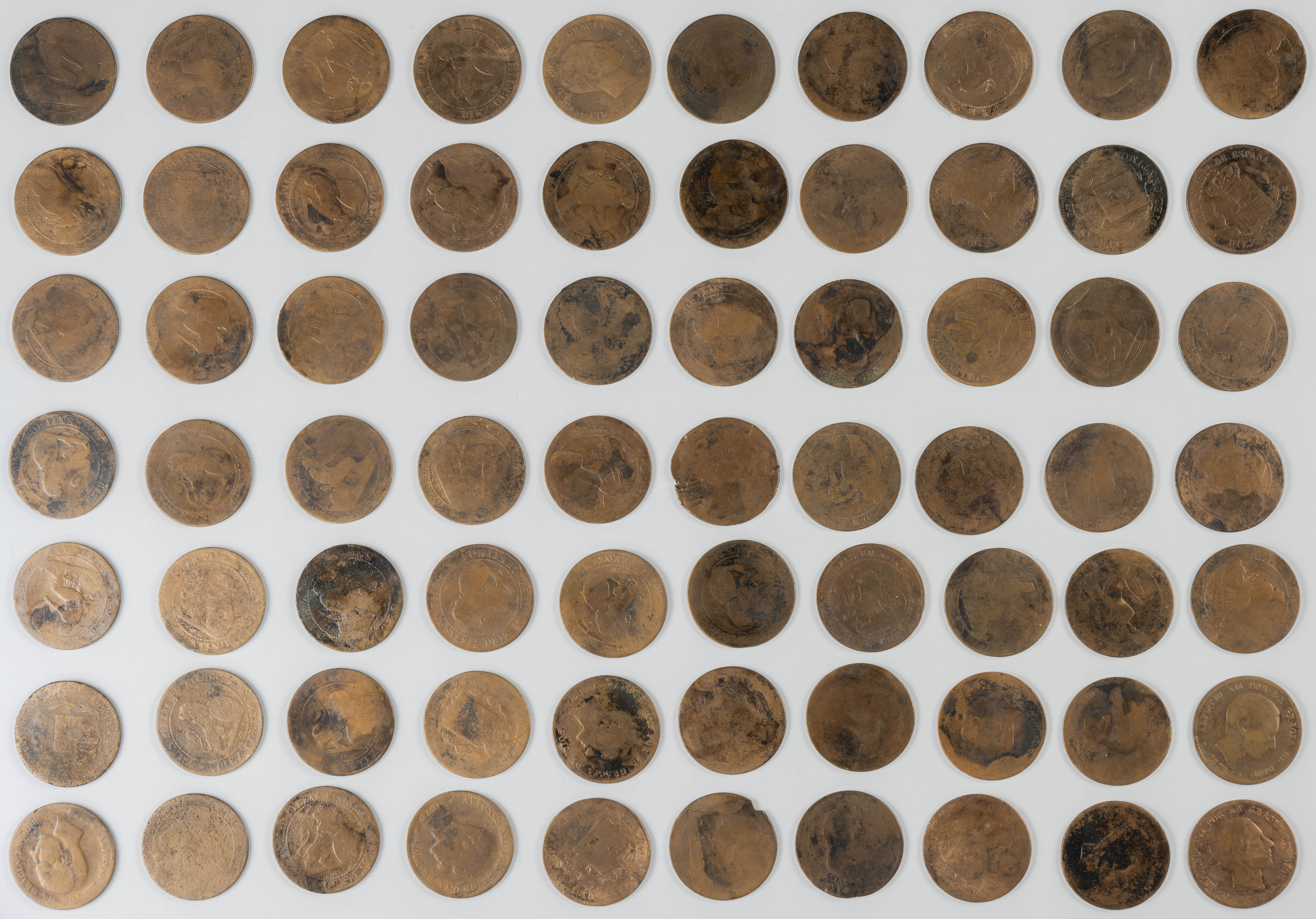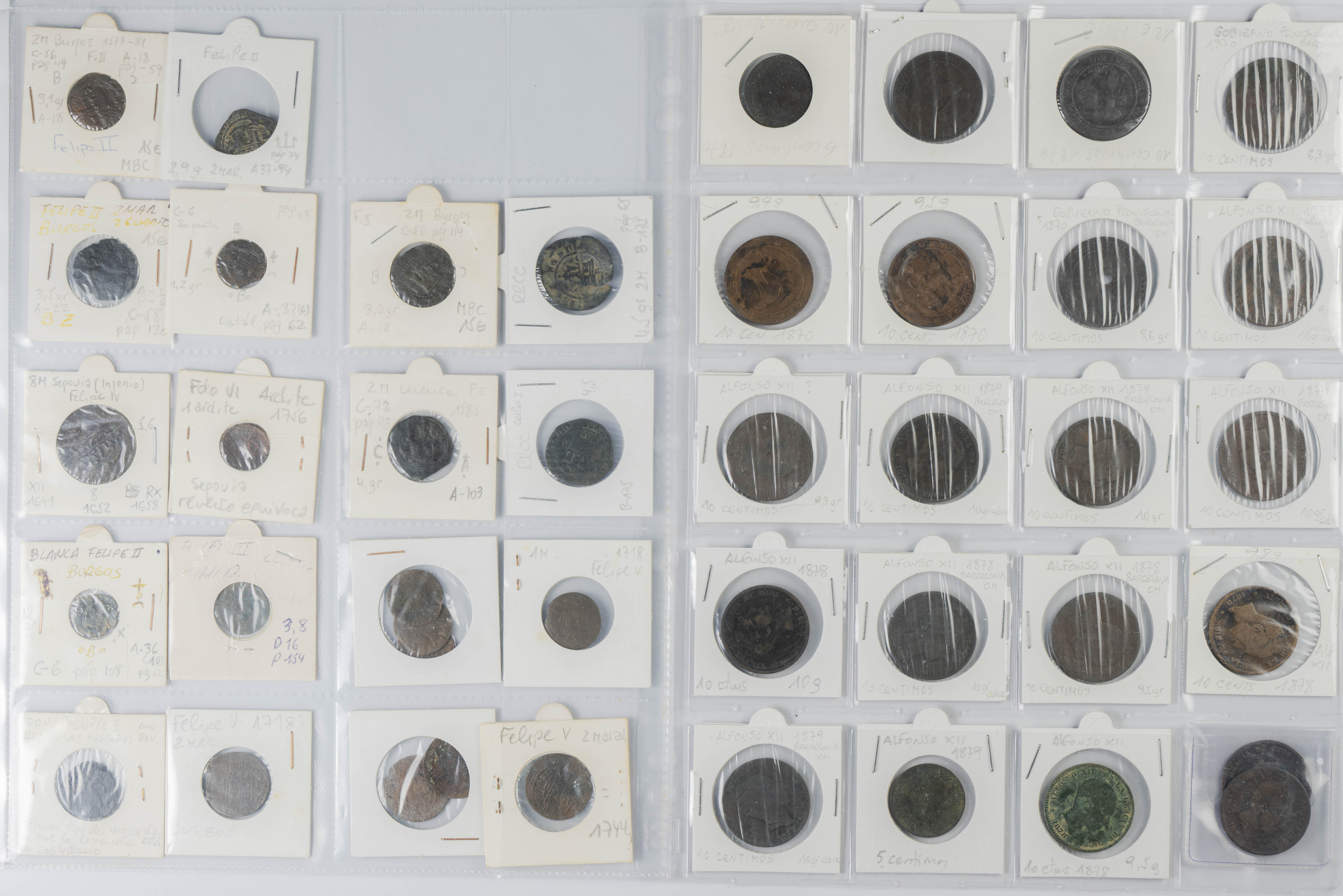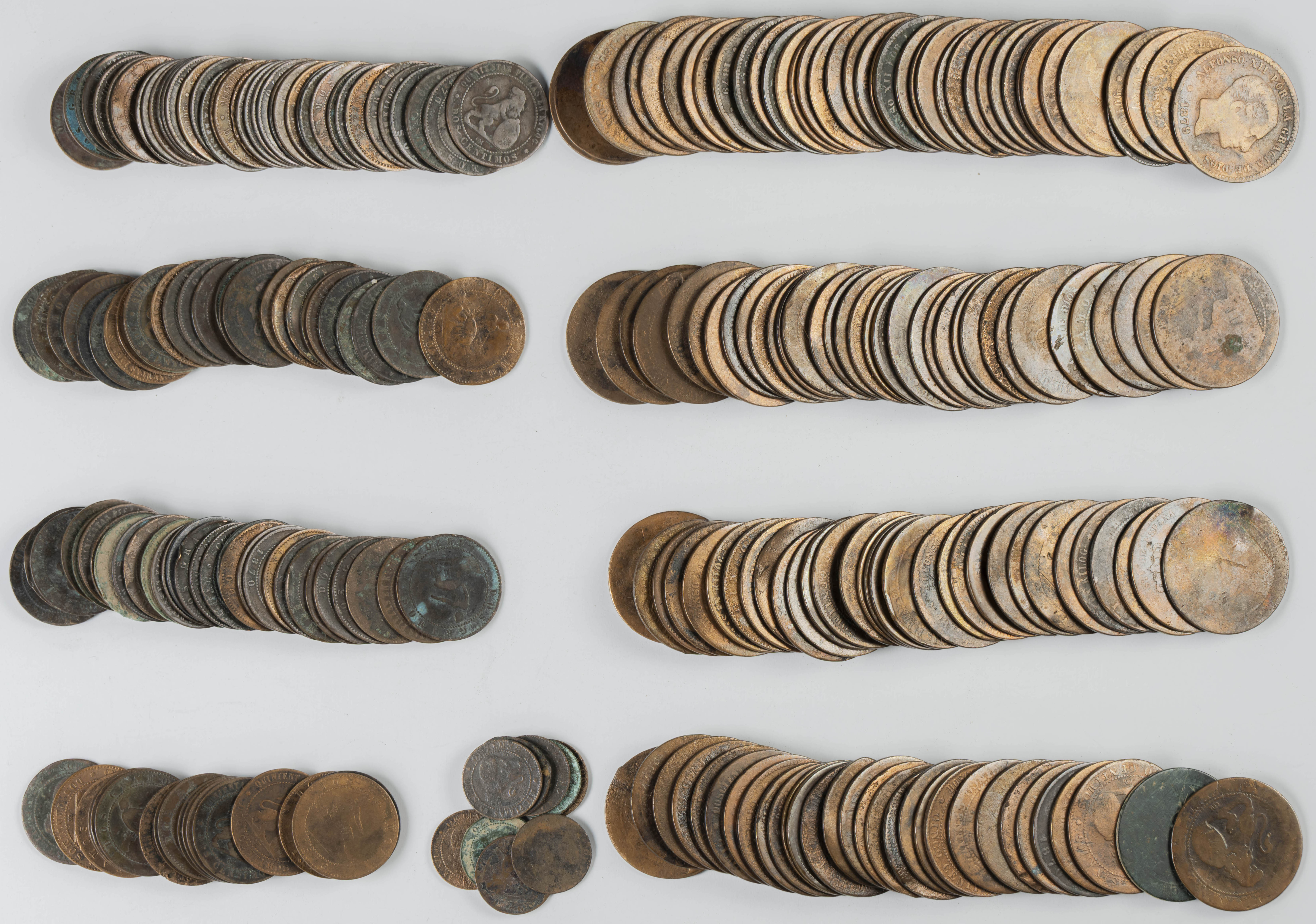 MONARQUÍA ESPAÑOLA. Conjunto formado por centenares de cobres de la Monarquía Española y del Centenario de la Peseta. Incluye piezas tanto de los Austrias como de los Borbones con una gran variedad de módulos y fechas representadas con una buena representación, también, de piezas reselladas. Diferentes estados de conservación. A EXAMINAR.