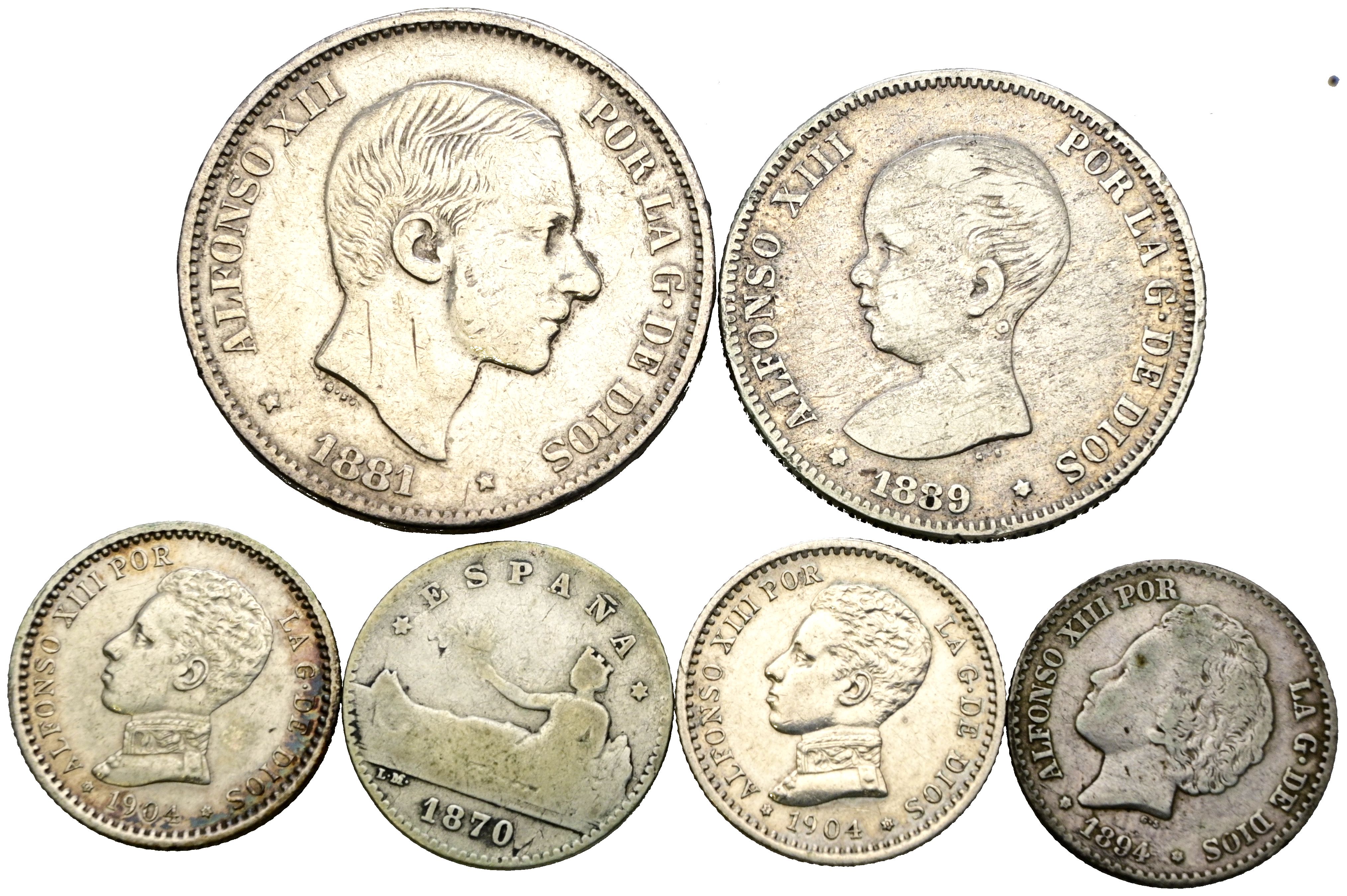 CENTENARIO DE LA PESETA. Interesante conjunto de 6 piezas en plata de diferentes módulos y que incluye acuñaciones del Gobierno Provisional y Alfonso XII y Alfonso XIII. Diferentes estados de conservación. A EXAMINAR.
