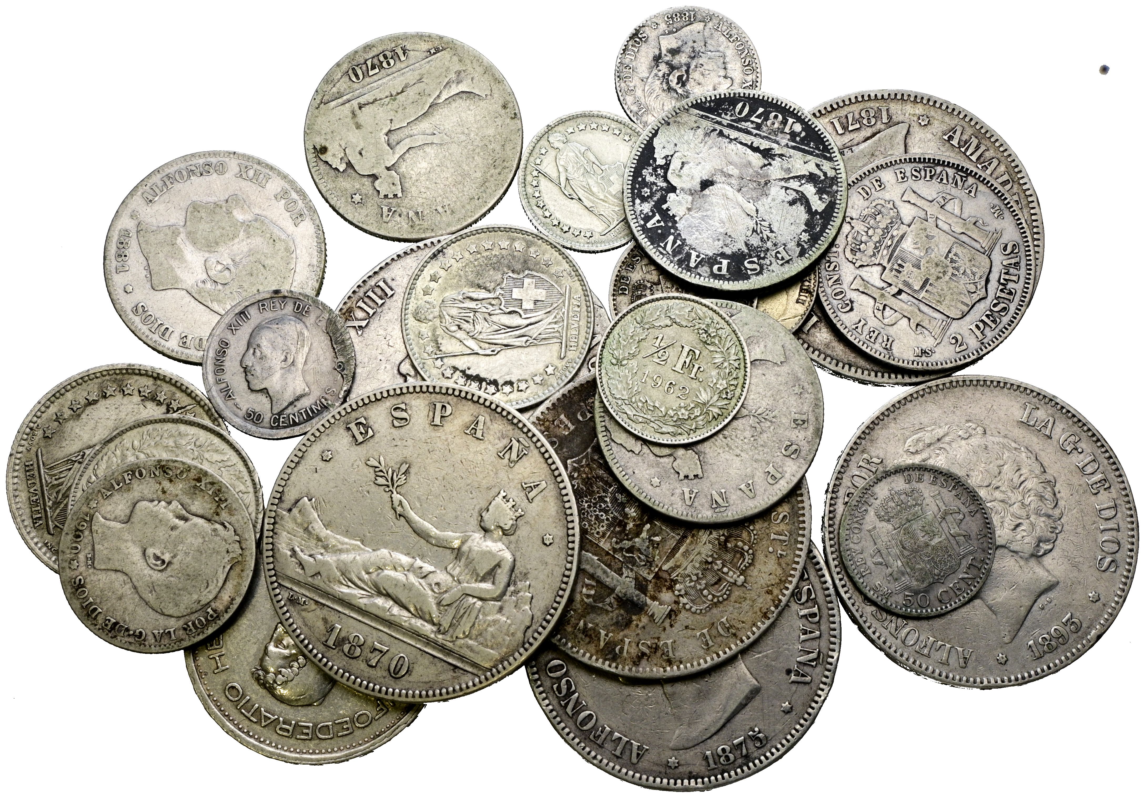 CENTENARIO DE LA PESETA. Interesante cojunto formado por 24 acuñaciones en plata, la mayoría, españolas del siglo XIX y algunas suizas. Peso aproximado del conjunto: 250g. Diferentes módulos, cecas, años y estados de conservación. A EXAMINAR.