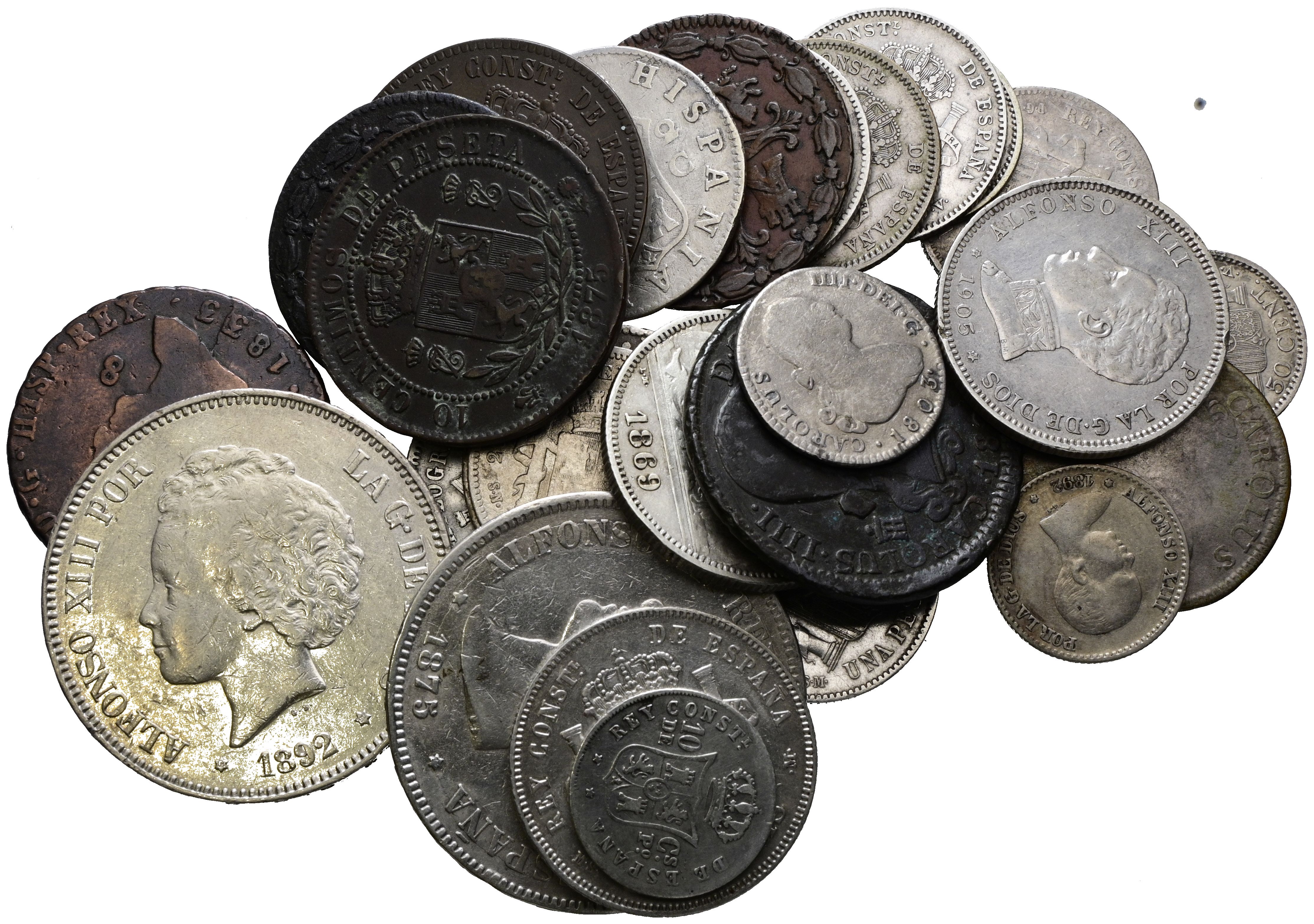 MONARQUÍA ESPAÑOLA Y CENTENARIO DE LA PESETA. Bonito e interesante conjunto de 30 monedas en su mayoría en plata y que no contiene ningún ejemplar repetido. Incluye 1 Peseta de la II República. Diferentes estados de conservación. A EXAMINAR.