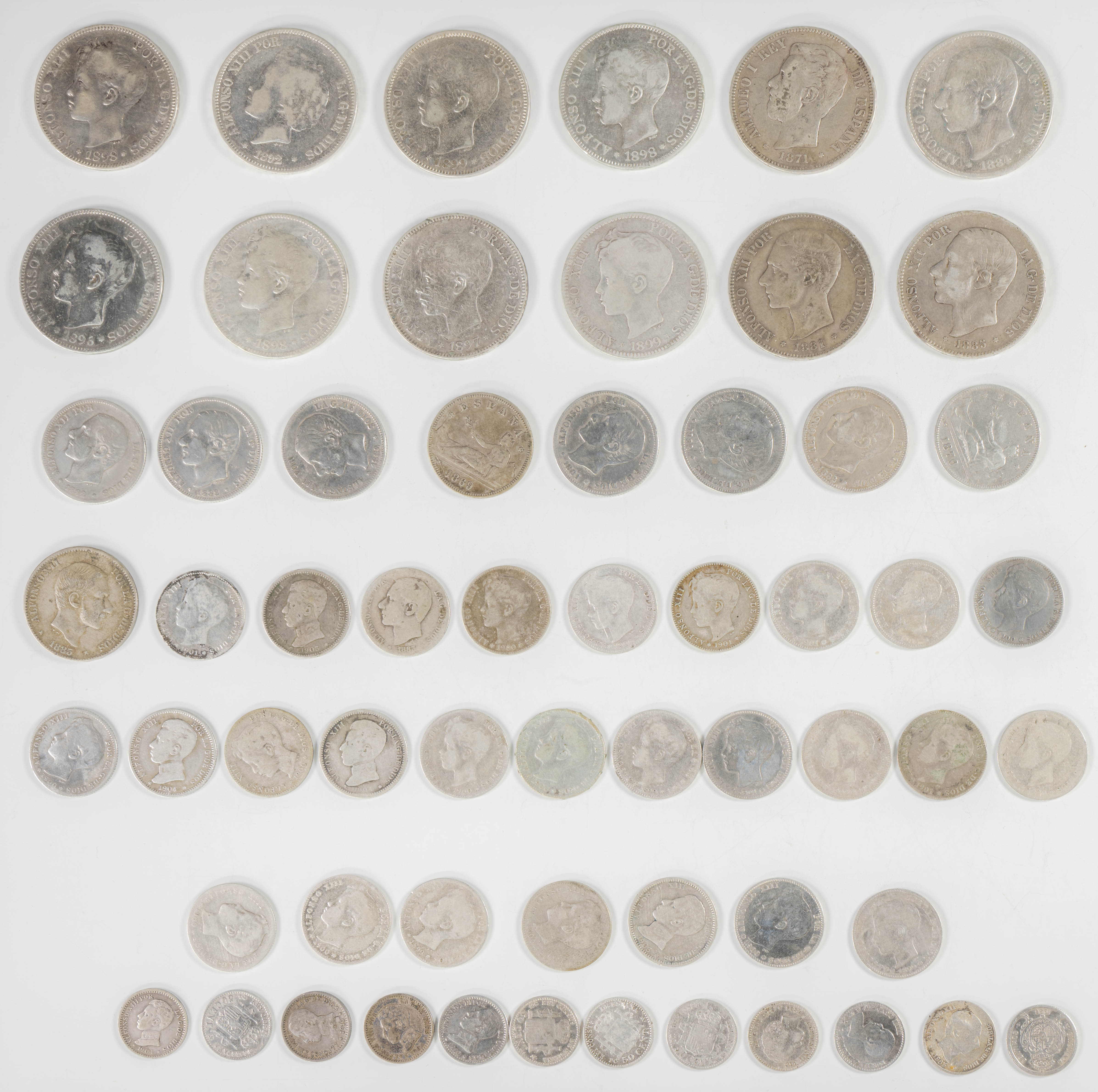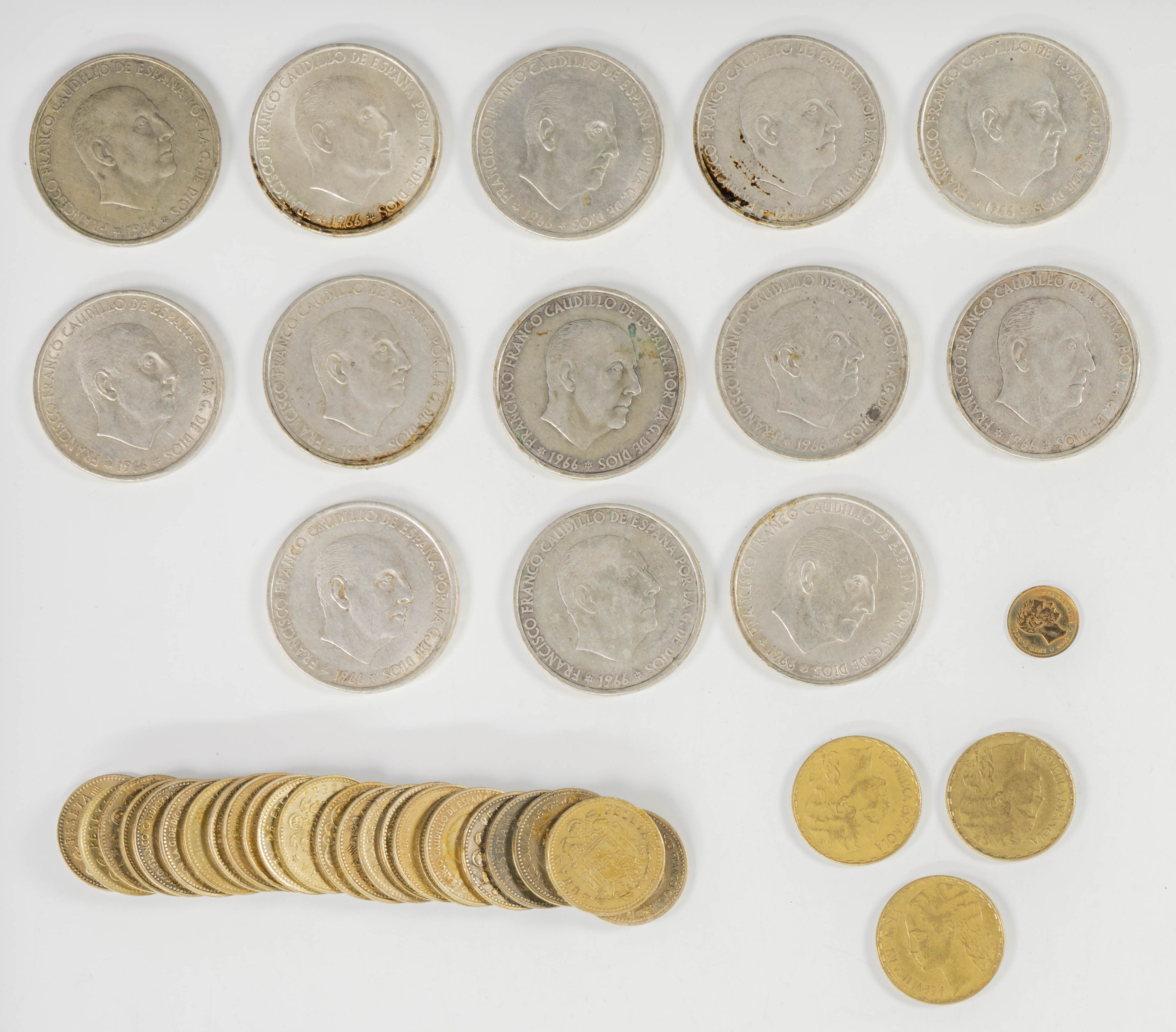 CENTENARIO DE LA PESETA Y ESTADO ESPAÑOL. Conjunto de más de 100 piezas de ambos periodos (más alguna Peseta republicana) donde destacan más de 70 monedas en plata (buena presencia del módulo de 5 Pesetas del Centenario de la Peseta y 100 Pesetas del Estado Español). Peso aproximado del conjunto en plata: 750g. Diferentes estados de conservación. A EXAMINAR.