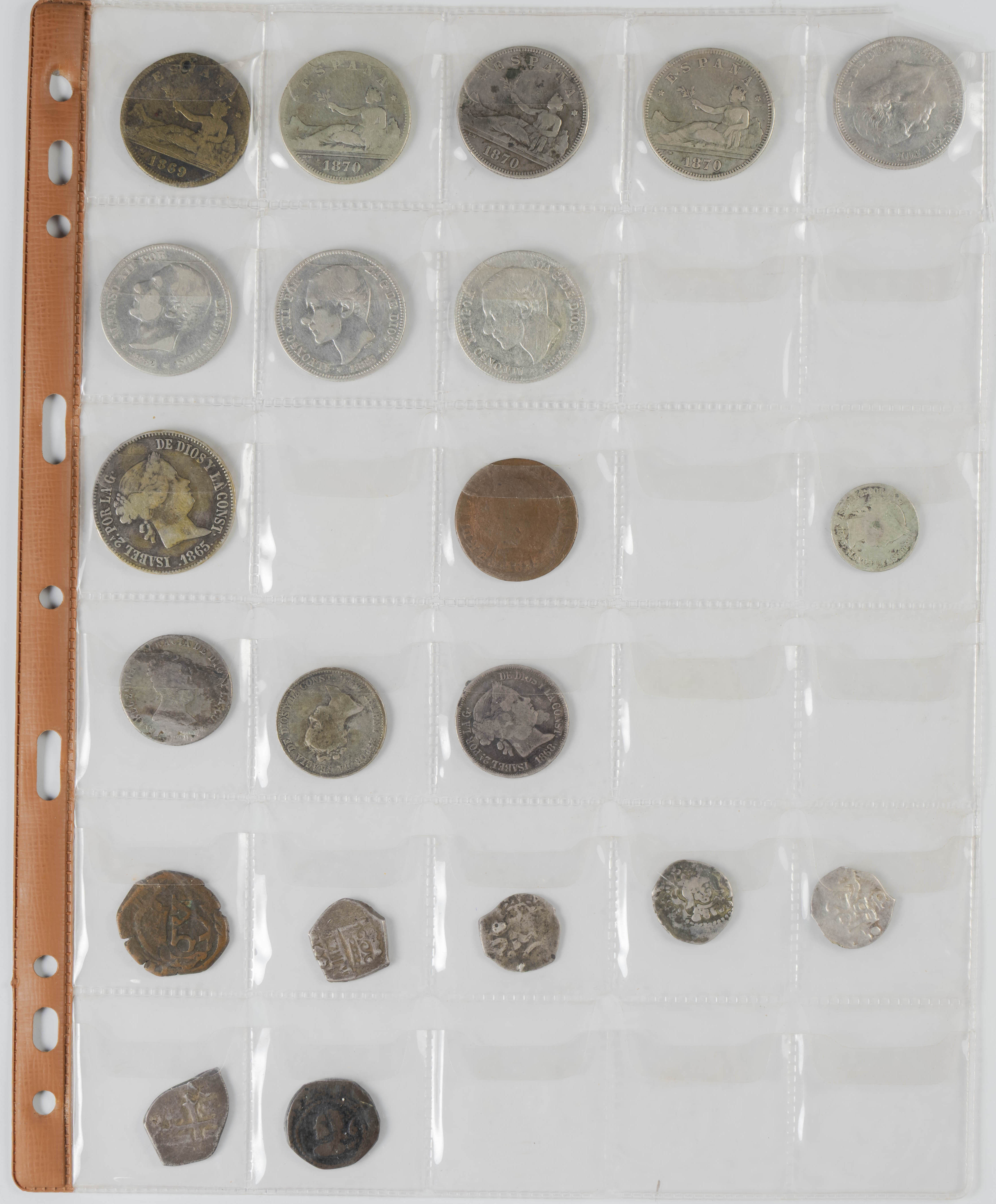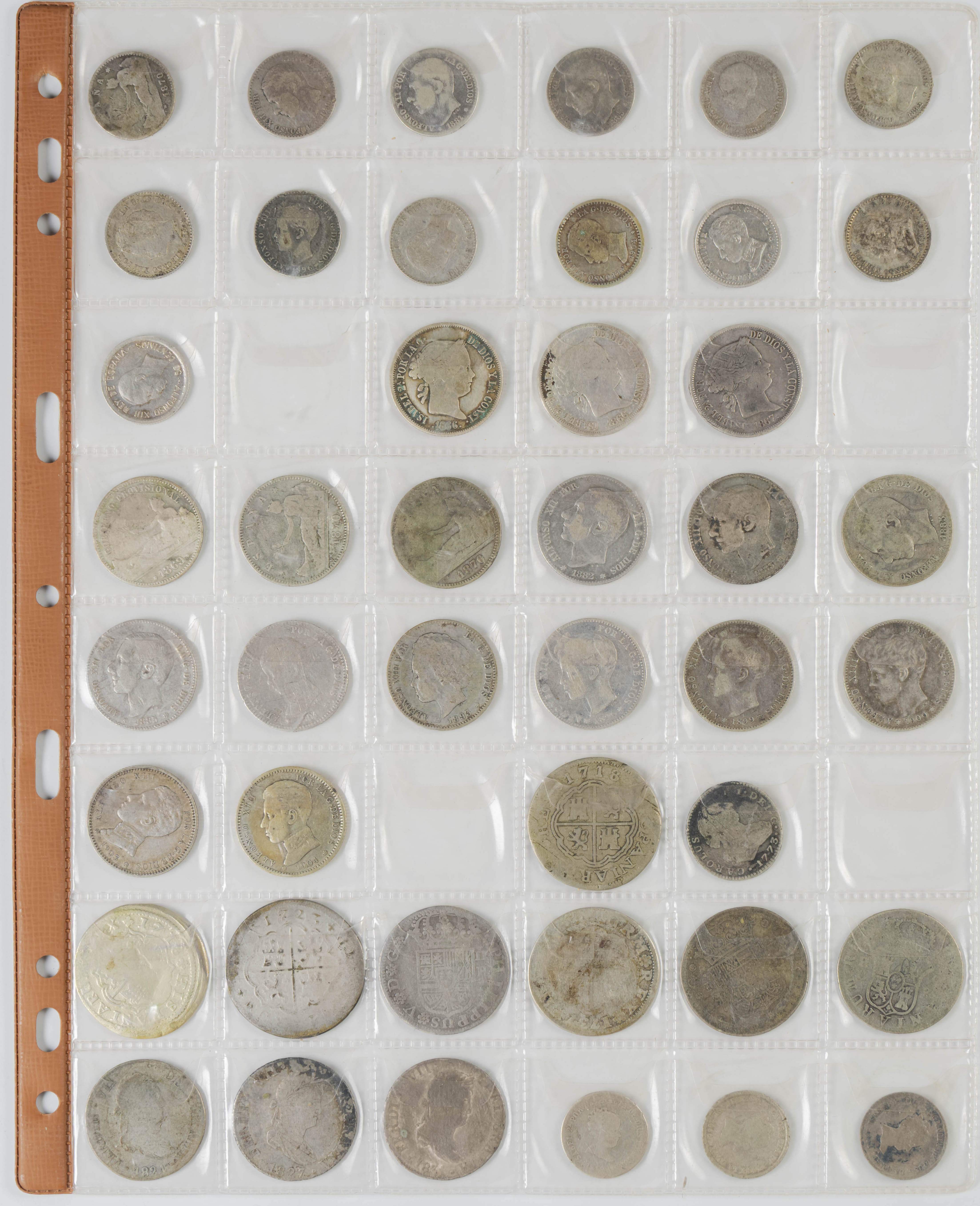 MONARQUÍA ESPAÑOLA Y CENTENARIO DE LA PESETA. Conjunto de casi 100 monedas de ambos periodos, la mayor parte de ellas en plata, con gran variedad de valores y fechas destacando 16 piezas de 5 Pesetas y un par de macuquinas de módulo pequeño. Diferentes estados de conservación. IMPRESCINDIBLE EXAMINAR.