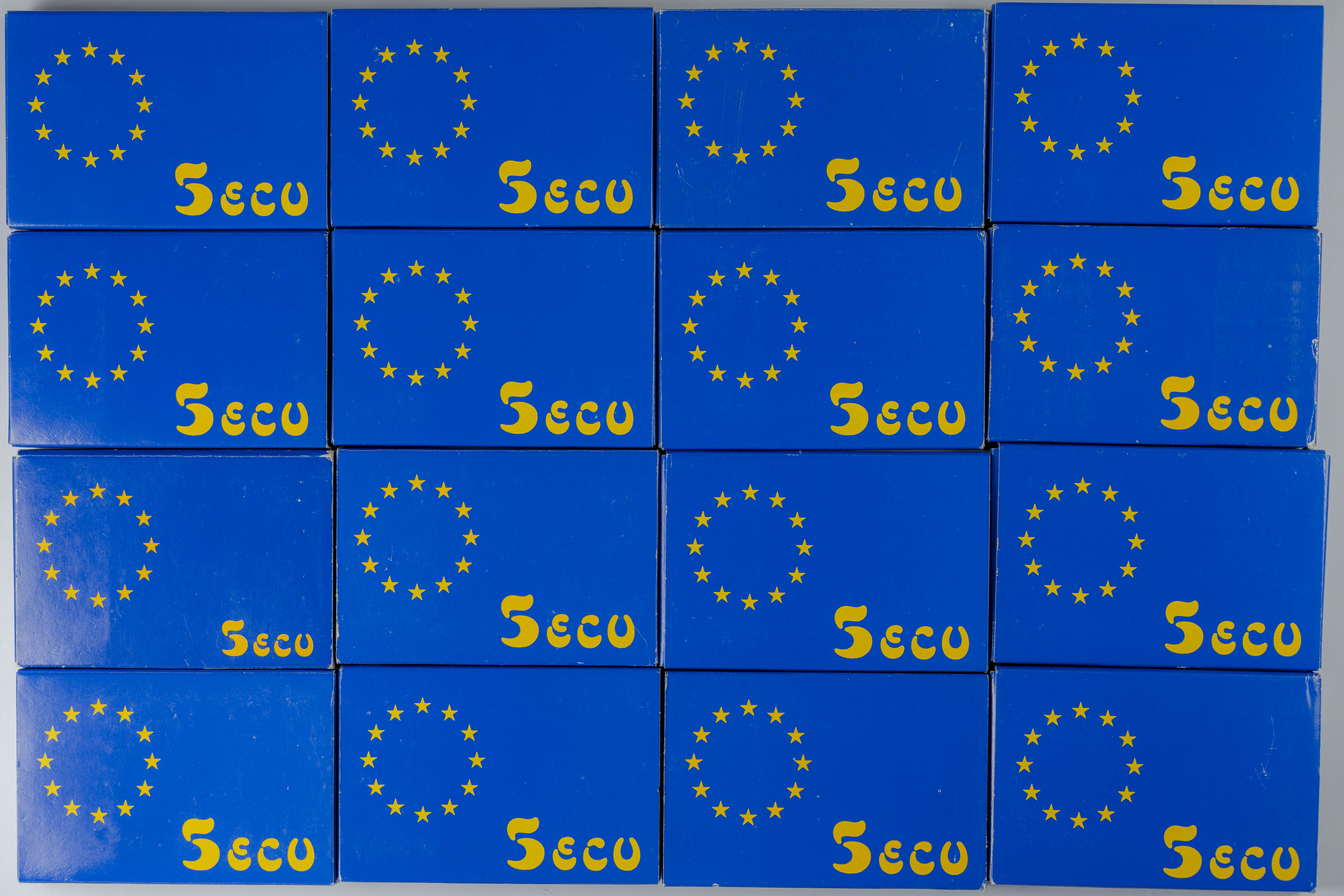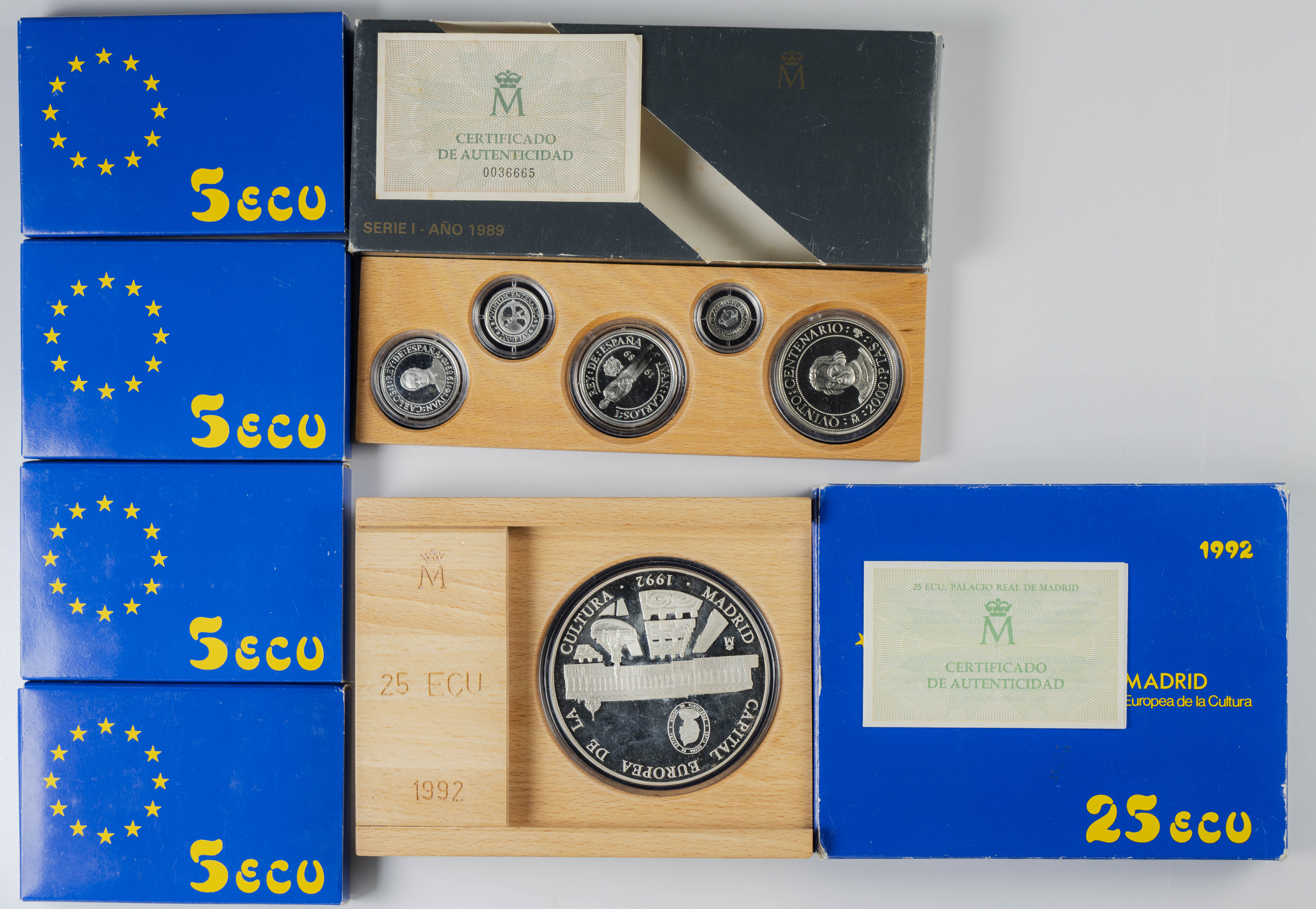 CONTEMPORÁNEO. Conjunto de 22 estuches con monedas en plata, de los que 20 corresponden al módulo de 5 Ecu (1989), 1 a 25 Ecu (1992) y el último a la serie del V Centenario (Serie I, 1989). FNMT. Incluyen estuches originales y certificados de autenticidad. A EXAMINAR.