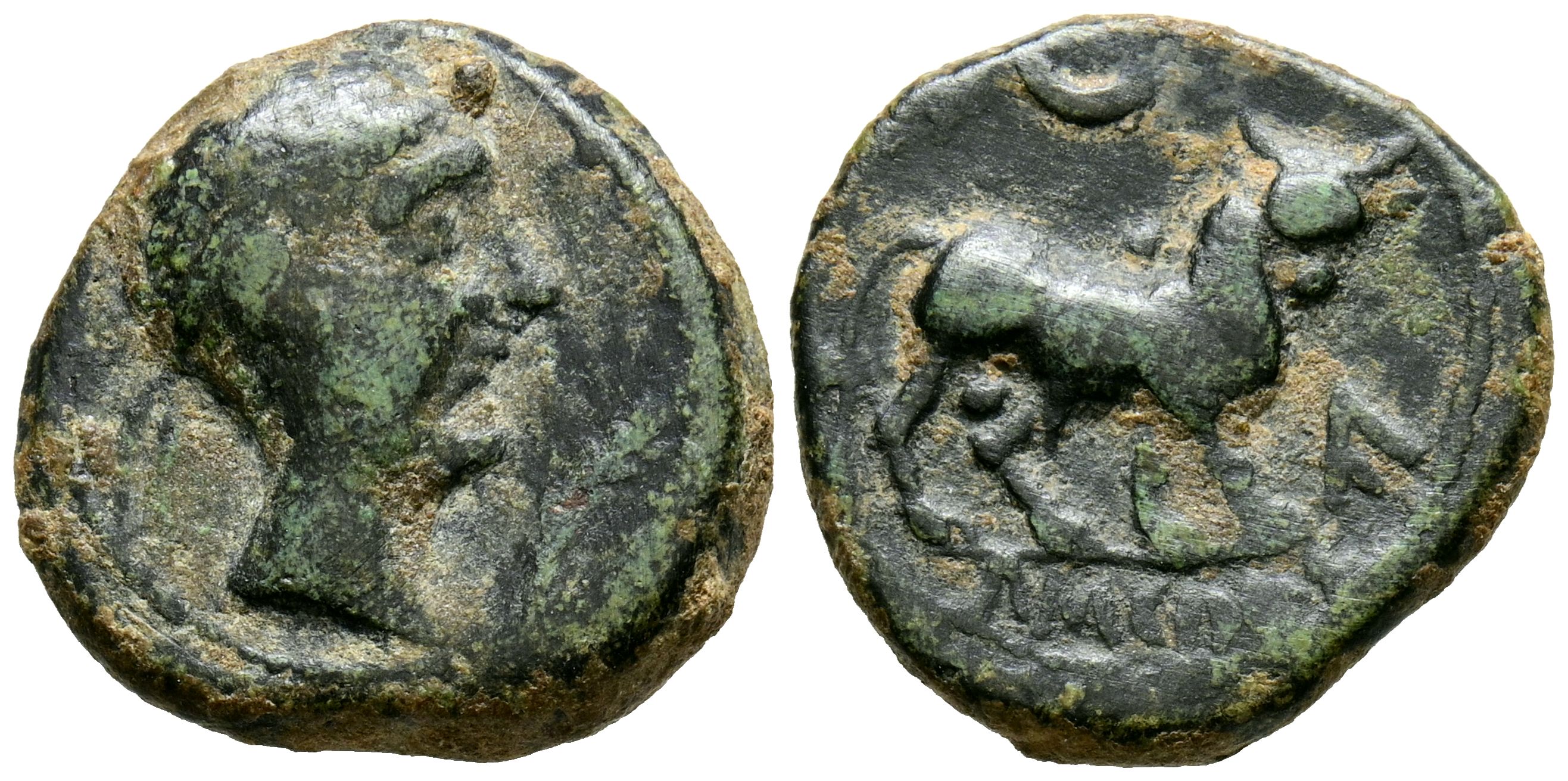 CASTULO (Cazlona, Jaén). Semis. (Ae. 4,38g/18mm). 180 a.C. (FAB-720). Anv: Cabeza masculina diademada a derecha, delante palma Rev: Toro a derecha, encima creciente, delante letra ibérica: Ca, en exergo leyenda ibérica: CaSTeLe. MBC. Atractiva pátina verde.