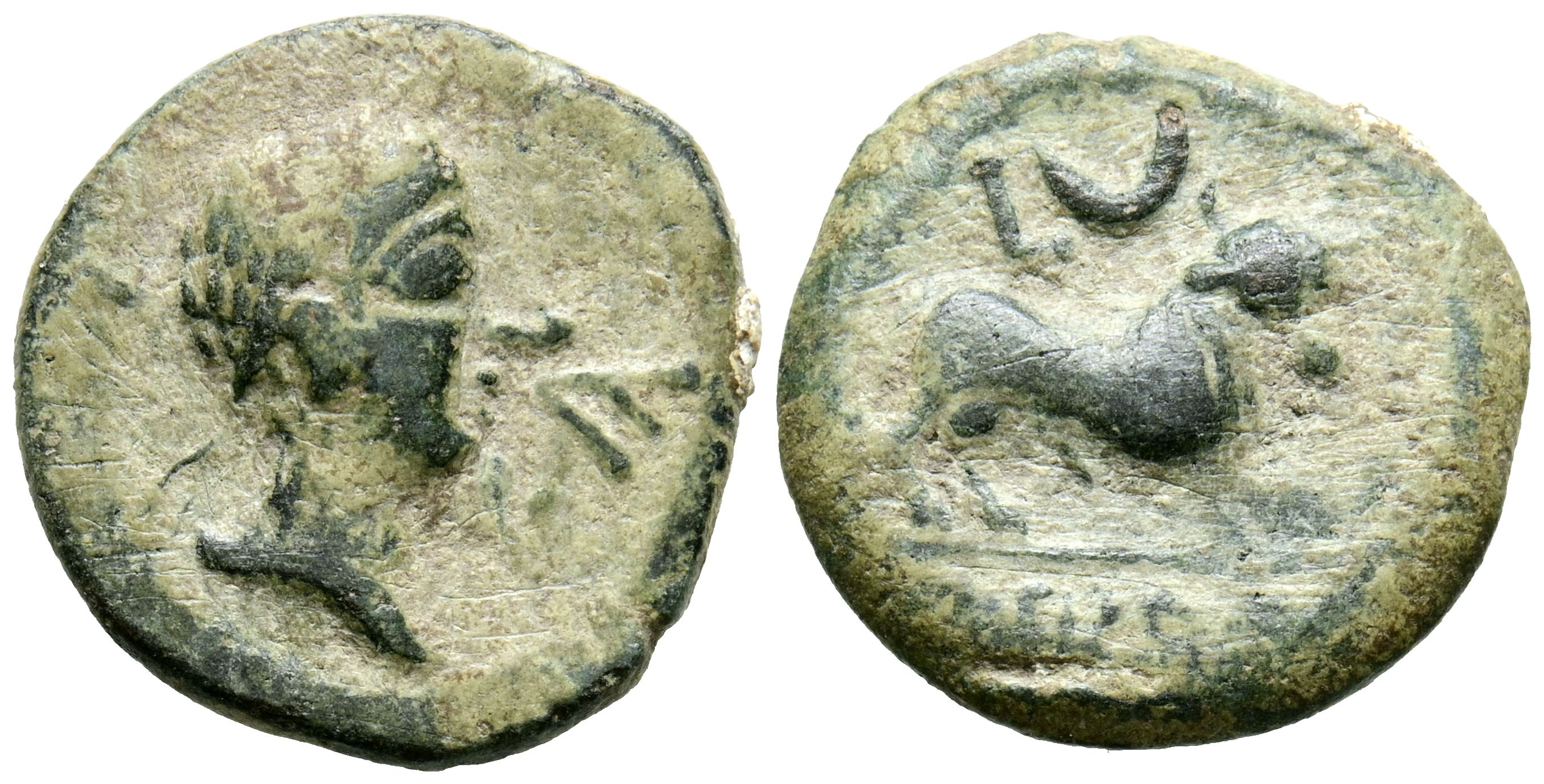 CASTULO (Cazorla, Jaén). Semis. (Ae. 4,49g/19mm). 180 a.C. (FAB-722). Anv: Cabeza masculina diademada a derecha, delante letra ibérica: Ca. Rev: Toro a derecha partiendo leyenda con las patas, encima letra L y creciente, en exergo leyenda ibérica: CaSTeLe. MBC.
