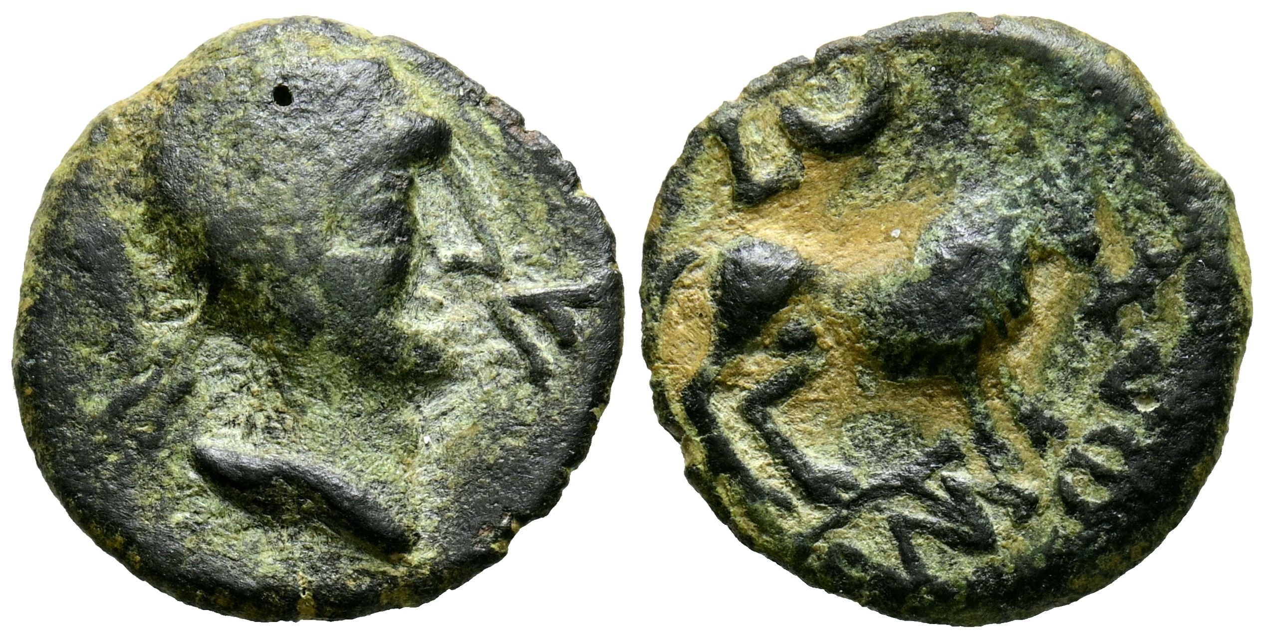 CASTULO (Cazlona, Jaén). Semifinales. (Ae. 2,89g/18mm). 180 a.C. (FAB-722). Anv: Cabeza masculina diademada a derecha, delante letra ibérica: Ca. Rev: Toro a derecha partiendo leyenda con las patas, encima letra L y creciente, en exergo leyenda ibérica: CaSTeLe. MBC.