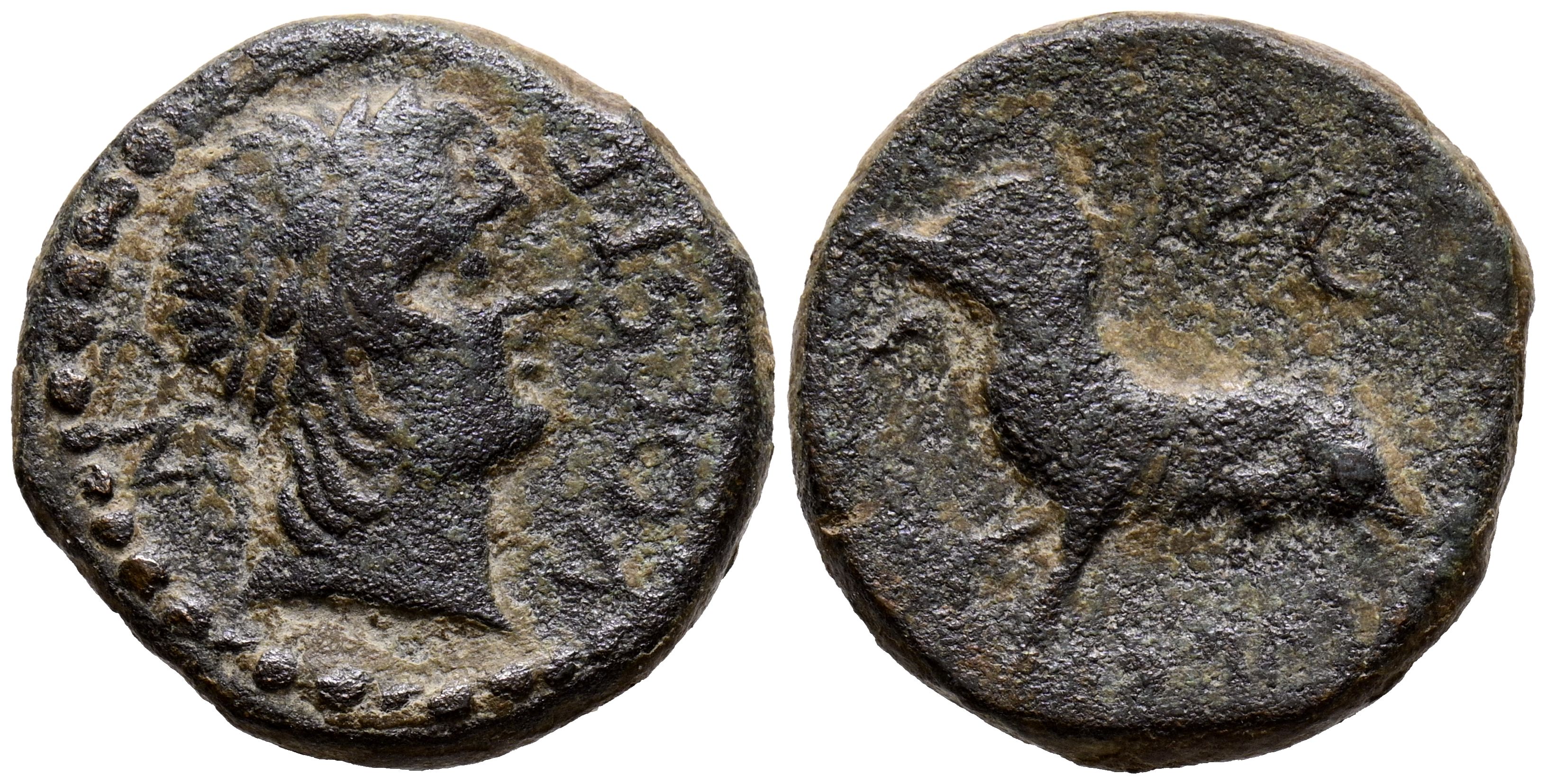 CASTULO (Cazlona, Jaén). Semis. (Ae. 9,13g/23mm). 180 a.C. (FAB-728). Anv: Cabeza masculina diademada a derecha, alrededor leyenda: CN VOC STFR. Rev: Toro a derecha, encima: CN y creciente, delante: CN FVL CN F, en exergo leyenda ibérica: CaSTeLe. MBC-.