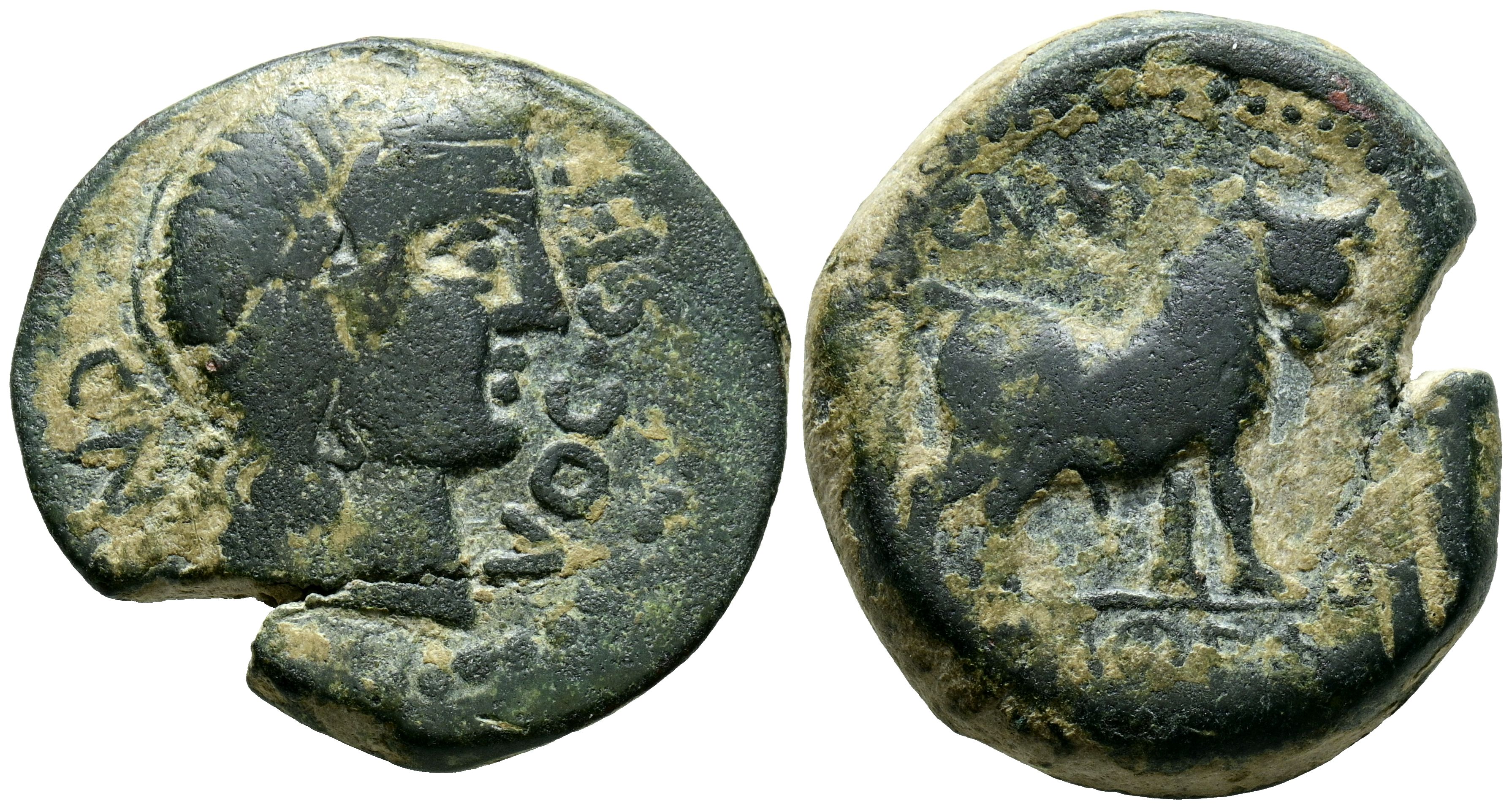 CASTULO (Cazlona, Jaén). Semis. (Ae. 14,05g/26mm). (FAB-728). Anv: Cabeza masculina diademada a derecha, alrededor leyenda: CN VOC STFR. Rev: Toro a derecha, encima: CN creciente, delante: CN FVL CN F, debajo leyenda ibérica: CaSTeLe. MBC-.
