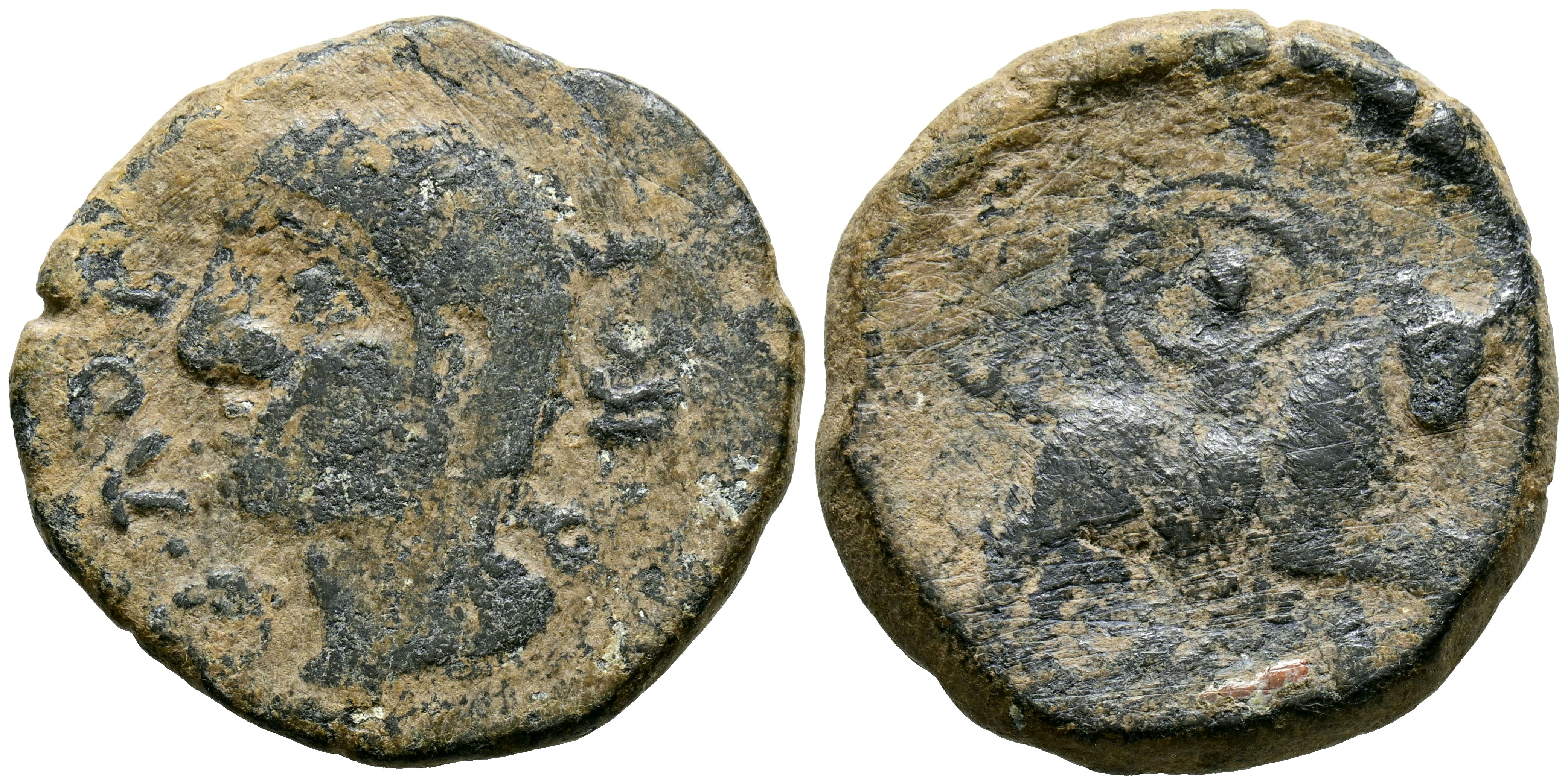 CASTULO (Cazlona, Jaén). As. (Ae. 13,56g/30mm). 180 a.C. (FAB-747). Anv: Cabeza masculina a izquierda, alrededor leyenda: L QVL F O ISC F. Rev: Rapto de Europa a derecha, debajo leyenda: MCF. MBC-.