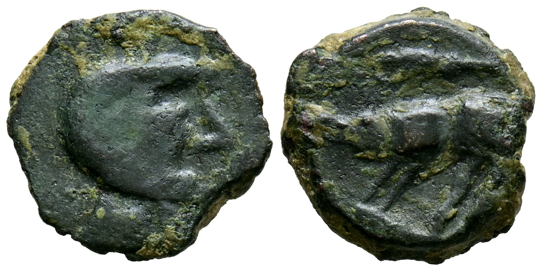 CASTULO (Cazlona, Jaén). Cuadrante. (Ae. 1,45g/13mm). 180 a.C. (FAB-757). Anv: Cabeza masculina a derecha. Rev: Jabalí a izquierda, encima mazo. BC+.
