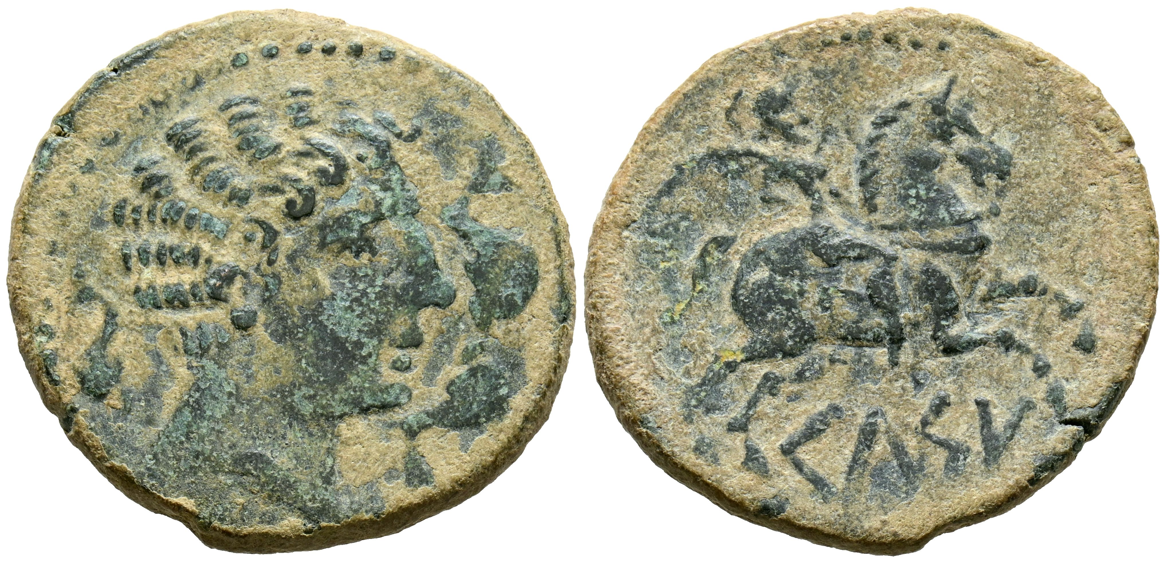 CELSE (Velilla de Ebro, Zaragoza). As. (Ae. 10,36g/29mm). 120-50 a.C. (FAB-771). Anv: Cabeza masculina a derecha con manto y fíbula, alrededor de tres delfines. Rev: Jinete con palma a derecha, debajo leyenda ibérica sobre línea: CeLSE. MBC.