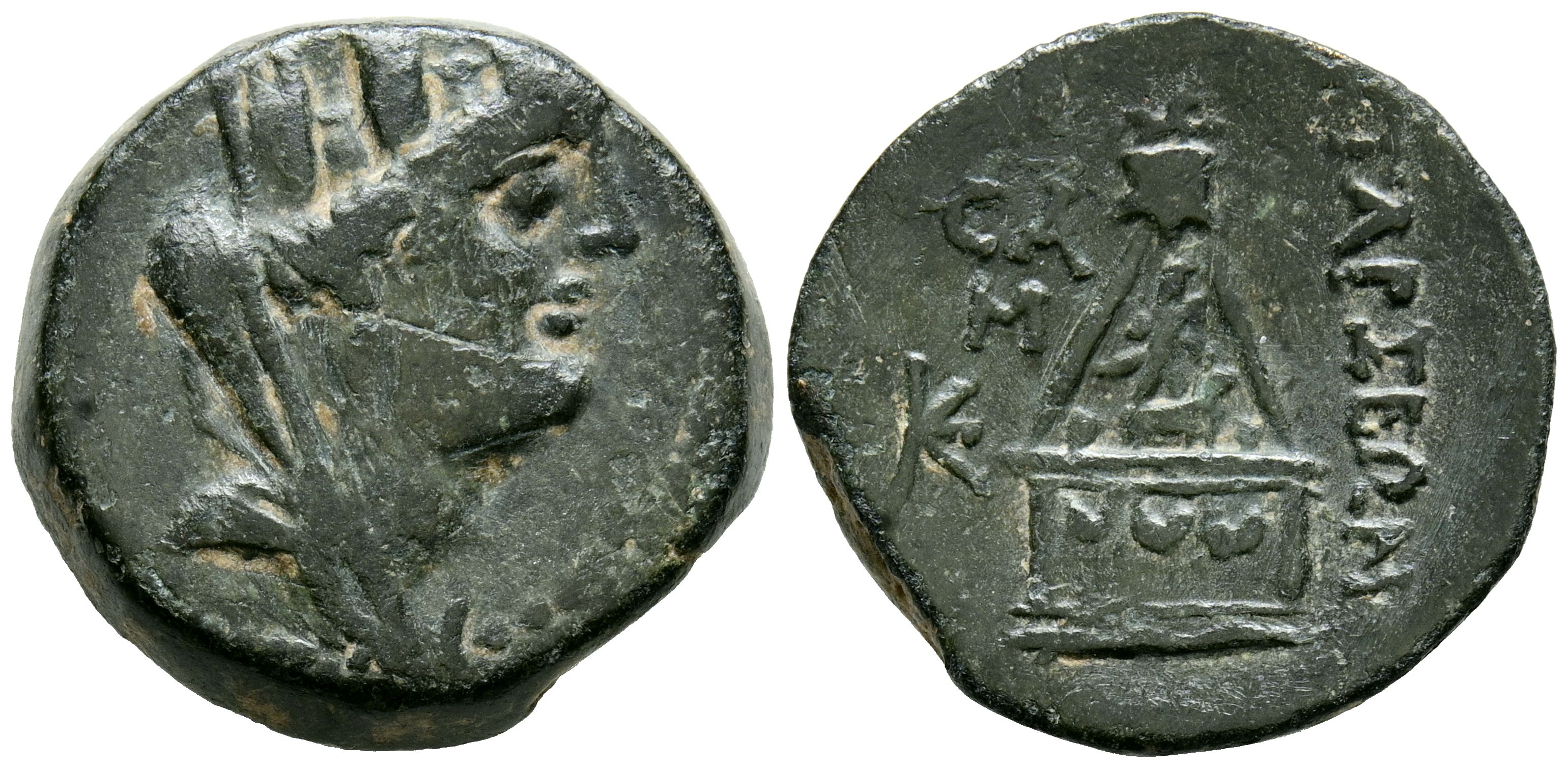 CILICIA, Tarsos. Ae21. (Ae. 7,64g/21mm). Siglo II a.C.-Siglo I a. C. (SNG Levante 945-6). Anv: Cabeza con corona mural de Tyche a la derecha. Rev: Pira de Sandan; Sandan sobre la espalda de un león-grifo de pie a la derecha entre dos onfaloi, todo en un altar con guirnaldas bajo un baldaquino piramidal, a la derecha leyenda: TΑΡΣΕΩΝ, dos monogramas a la izquierda. MBC-.