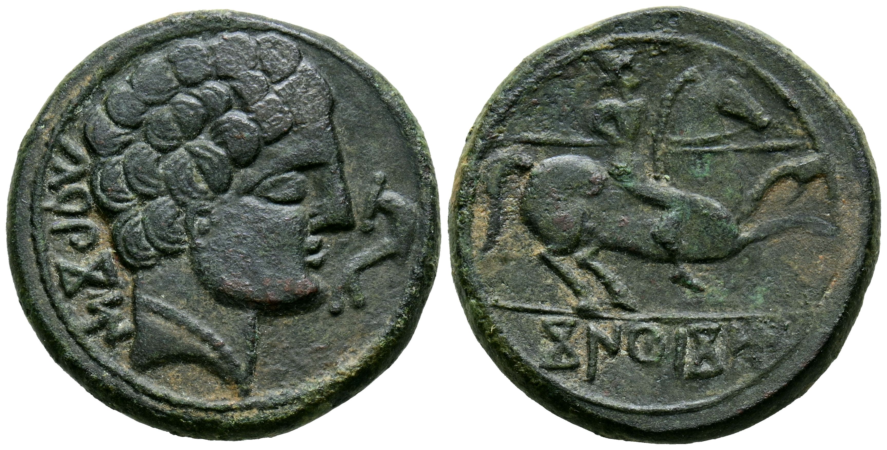 CONTERBIA CARBICA (Huete, Cuenca). As. (Ae. 9,97g/24mm). 120-80 a.C. (FAB-846). Anv: Cabeza masculina a derecha, detrás leyenda: CaRBiCa, delante delfín. Rev: Jinete con lanza a derecha, debajo leyenda ibérica bajo línea: CoNTeBaCoM. MBC+.