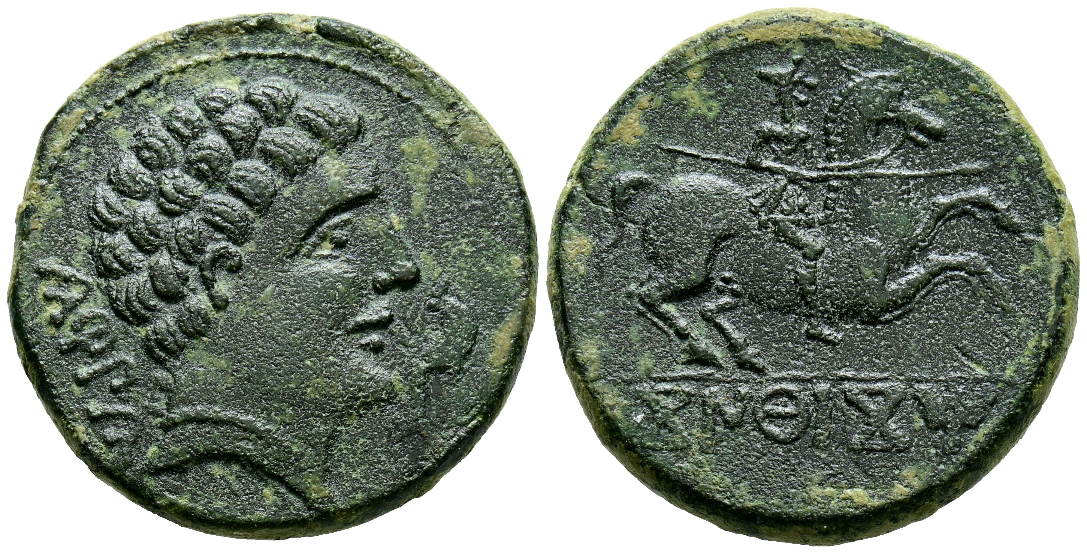 CONTERBIA CARBICA (Huete, Cuenca). As. (Ae. 10,88g/25mm). 120-80 a.C. (FAB-846). Anv: Cabeza masculina a derecha, detrás leyenda: CaRBiCa, delante delfín. Rev: Jinete con lanza a derecha, debajo leyenda ibérica bajo línea: CoNTeBaCoM. MBC.