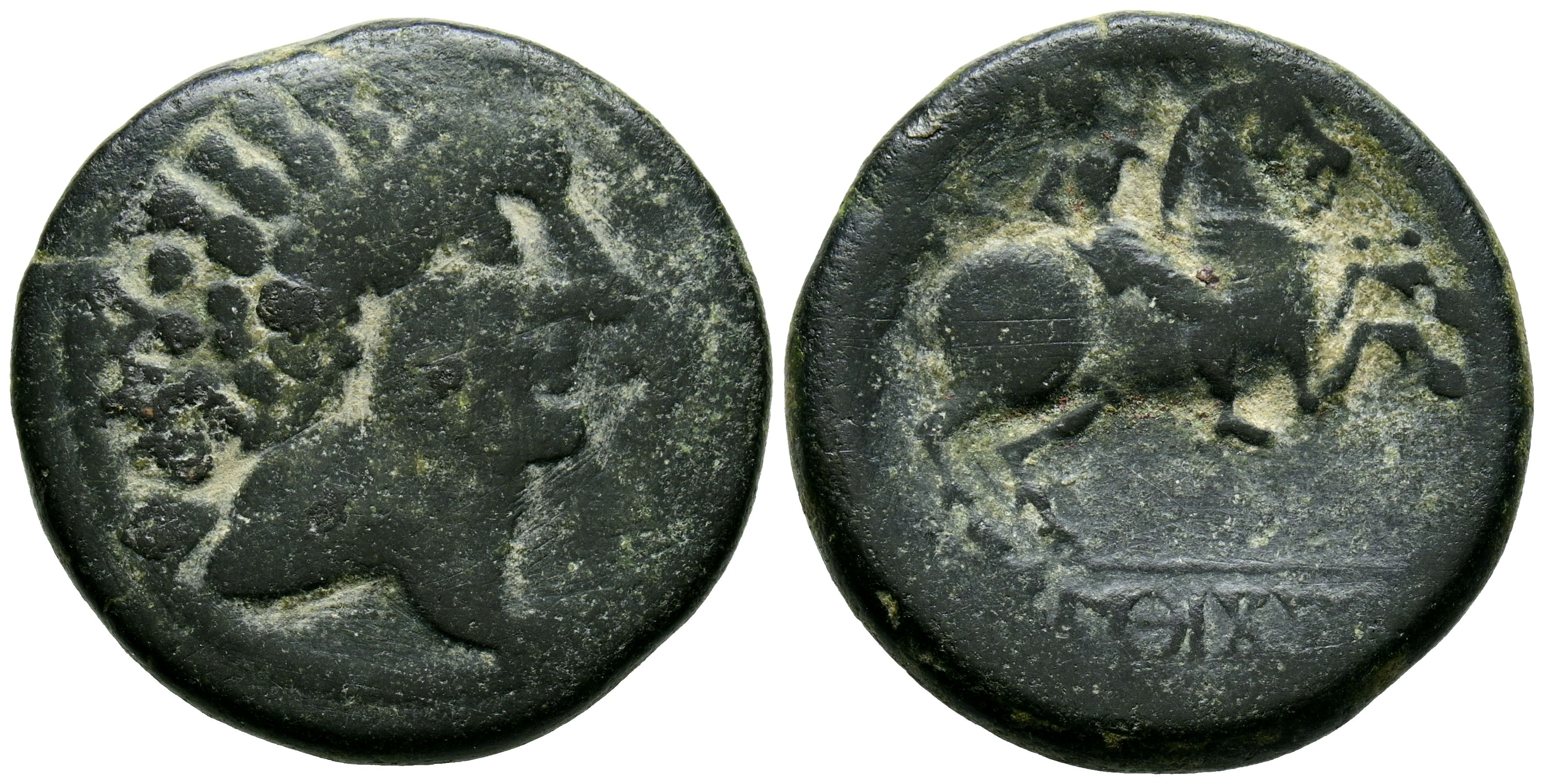 CONTERBIA CARBICA (Huete, Cuenca). As. (Ae. 9,52g/25mm). 120-80 a.C. (FAB-846). Anv: Cabeza masculina a derecha, detrás leyenda: CaRBiCa, delante delfín. Rev: Jinete con lanza a derecha, debajo leyenda ibérica bajo línea: CoNTeBaCoM. BC+.