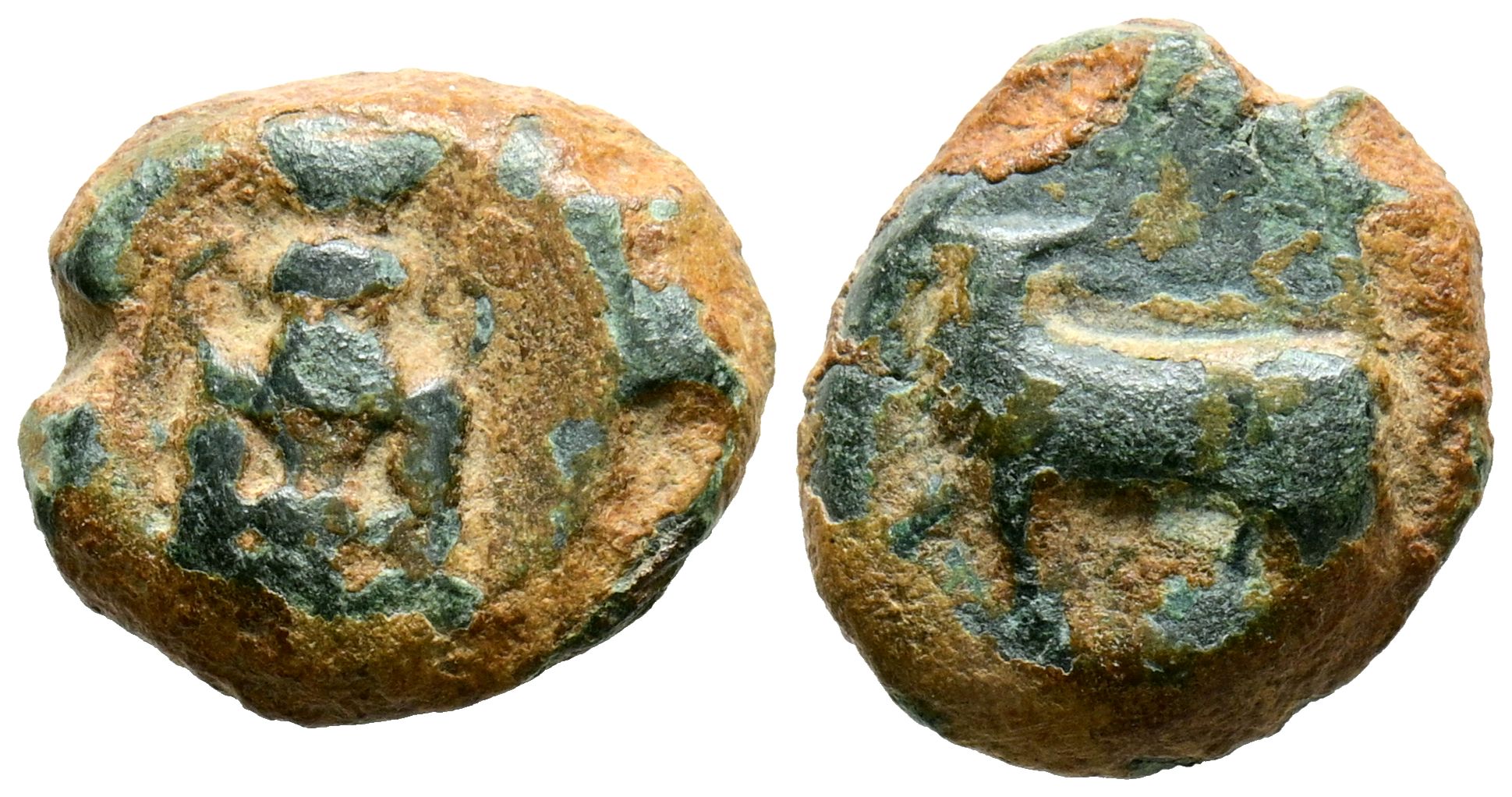EBUSUS (Ibiza). 1/4 Calco. (Ae. 3,10g/14mm). 300-200 a.C. (FAB-903). Anv: Bes desnudo con dos serpientes. Rev: Toro pasando a izquierda. MBC.