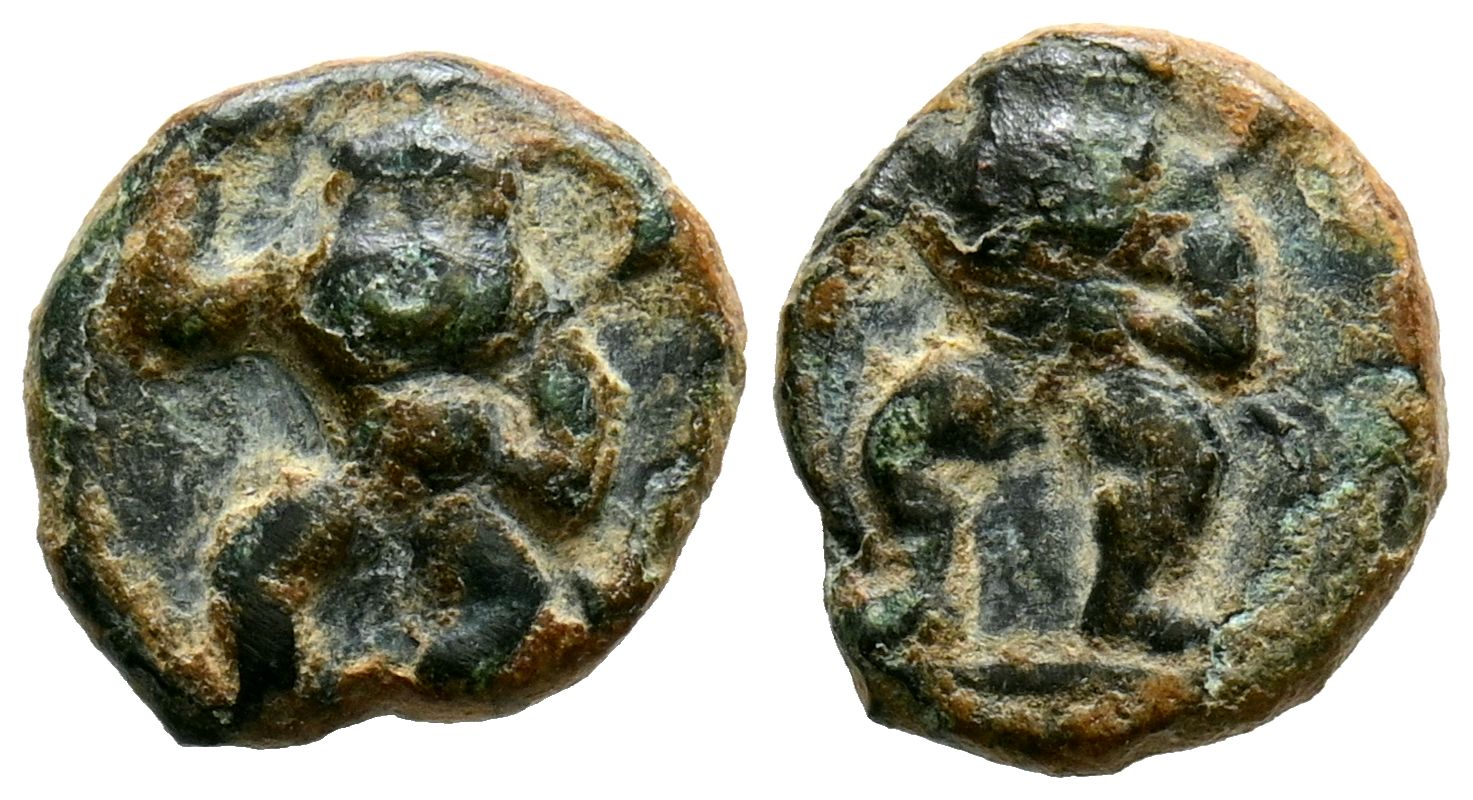 EBUSUS (Ibiza). 1/8 Calco. (Ae. 1,02g/11mm). 300-200 a.C. (FAB-913). Anv: Bes con faldellín de frente sosteniendo martillo y serpiente. Rev: Bes con faldellín de frente sosteniendo martillo y serpiente. MBC.