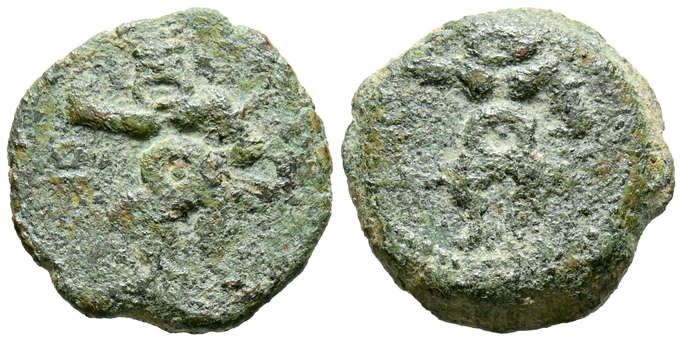 EBUSUS (Ibiza). 1/4 de Calco. (Ae. 2,91g/16mm). 300-200 a.C. (FAB-942). Anv: Bes con faldellín sosteniendo martillo y serpiente, símbolo de Tanit a izquierda. Rev: Bes con faldellín sosteniendo martillo y serpiente, símbolo de Tanit a izquierda. MBC-. Escasa.