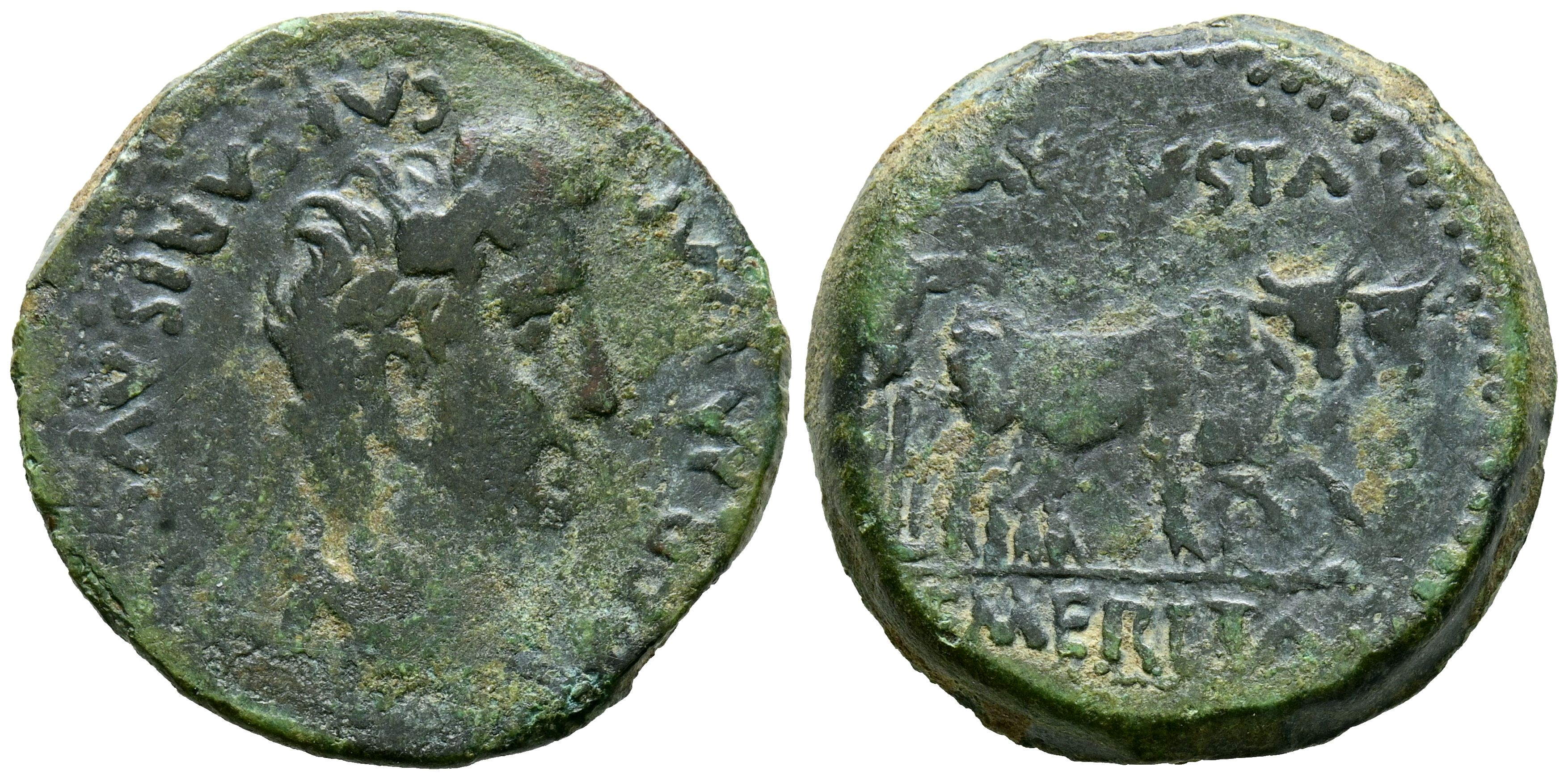 EMERITA AUGUSTA (Mérida, Badajoz). As. (Ae. 9,44g/26mm). 22 a.C.-14 d.C. (FAB-1012). Anv: Cabeza laureada de Augusto a derecha, alrededor leyenda: PERM IMP CAESARIS AVG P P. Rev: Yunta a derecha, alrededor leyenda: AVGVSTA EMERITA. MBC-.