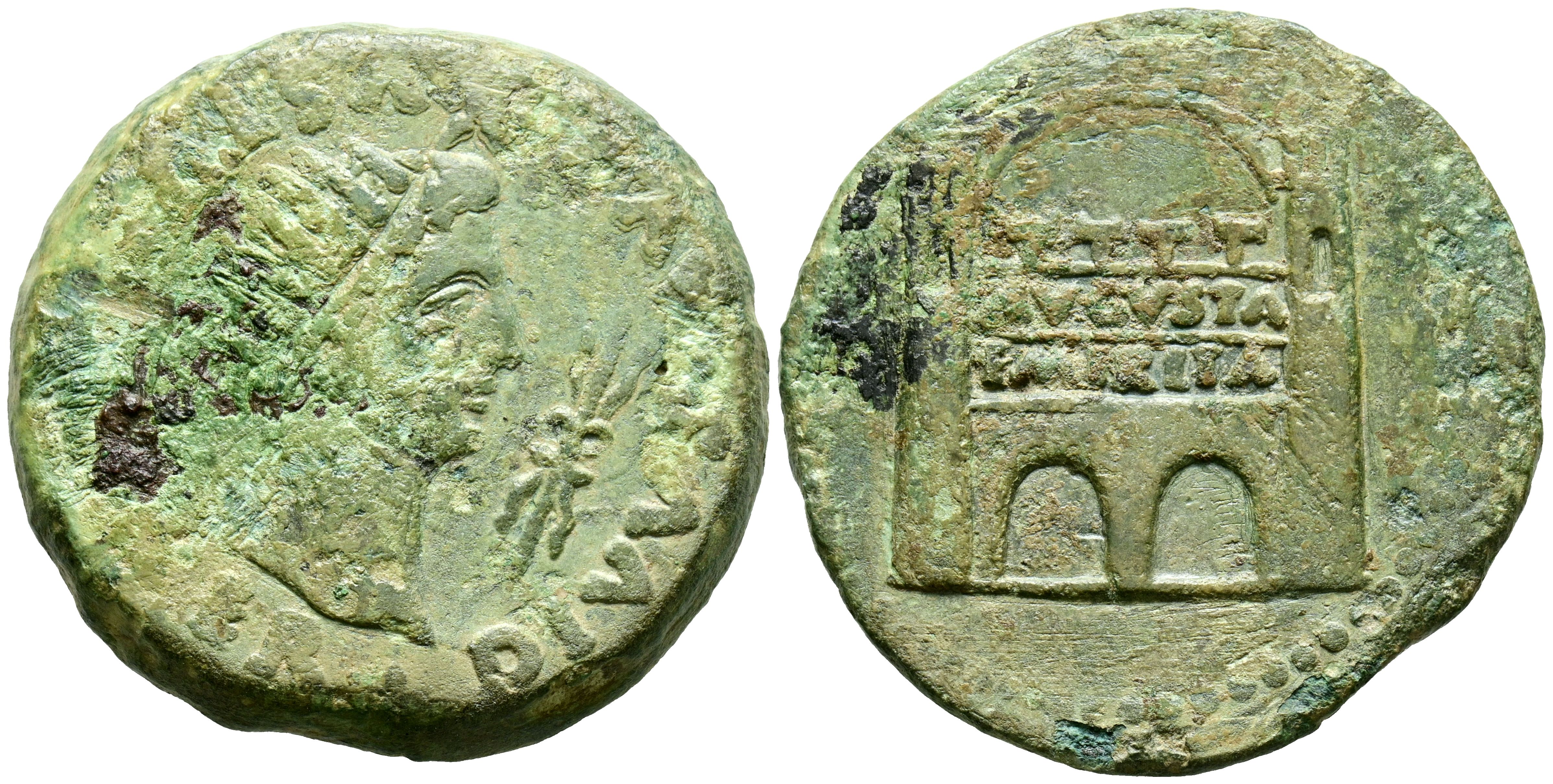 EMERITA AUGUSTA (Mérida, Badajoz). Dupondio. (Ae. 20,26g/33mm). 14-36 d.C. (FAB-1027). Anv: Cabeza radiada de Augusto a derecha, delante rayos, alrededor leyenda: DIVVS AVGVSTVS PATER. Rev: Puerta de la ciudad con inscripción: AVGVSTA/EMERITA. MBC+. Oxidaciones limpiadas en anverso. Texto No visible cedente