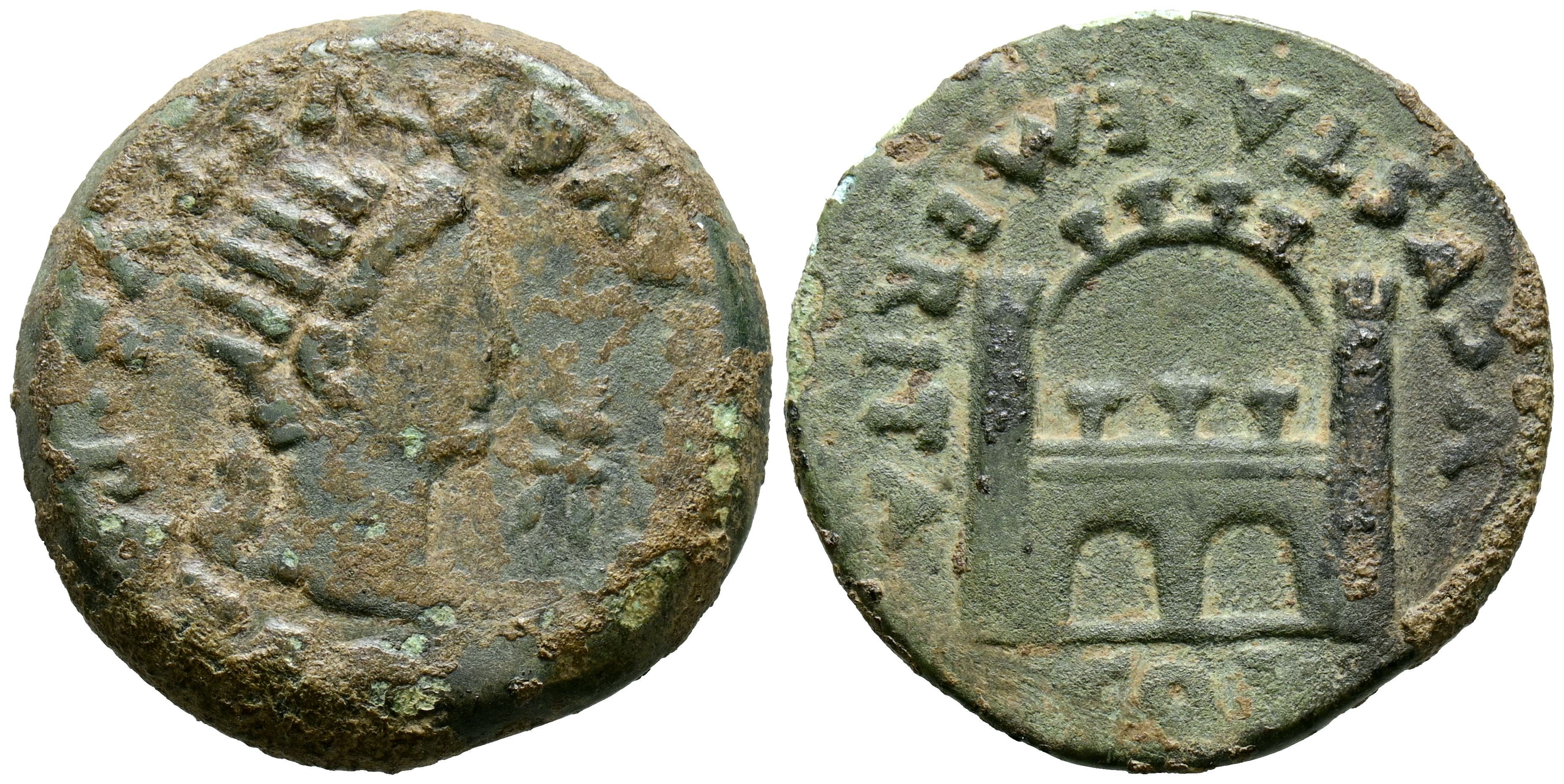EMERITA AUGUSTA (Mérida, Badajoz). As. (Ae. 9,63g/26mm). 14-36 d.C. (FAB-1040). Anv: Cabeza radiada de Augusto a derecha, encima estrella, delante rayos, alrededor leyenda: DIVVS AVGVSTVS PATER. Rev: Puerta de la ciudad, alrededor leyenda: COL AVGVSTA EMERITA. MBC.