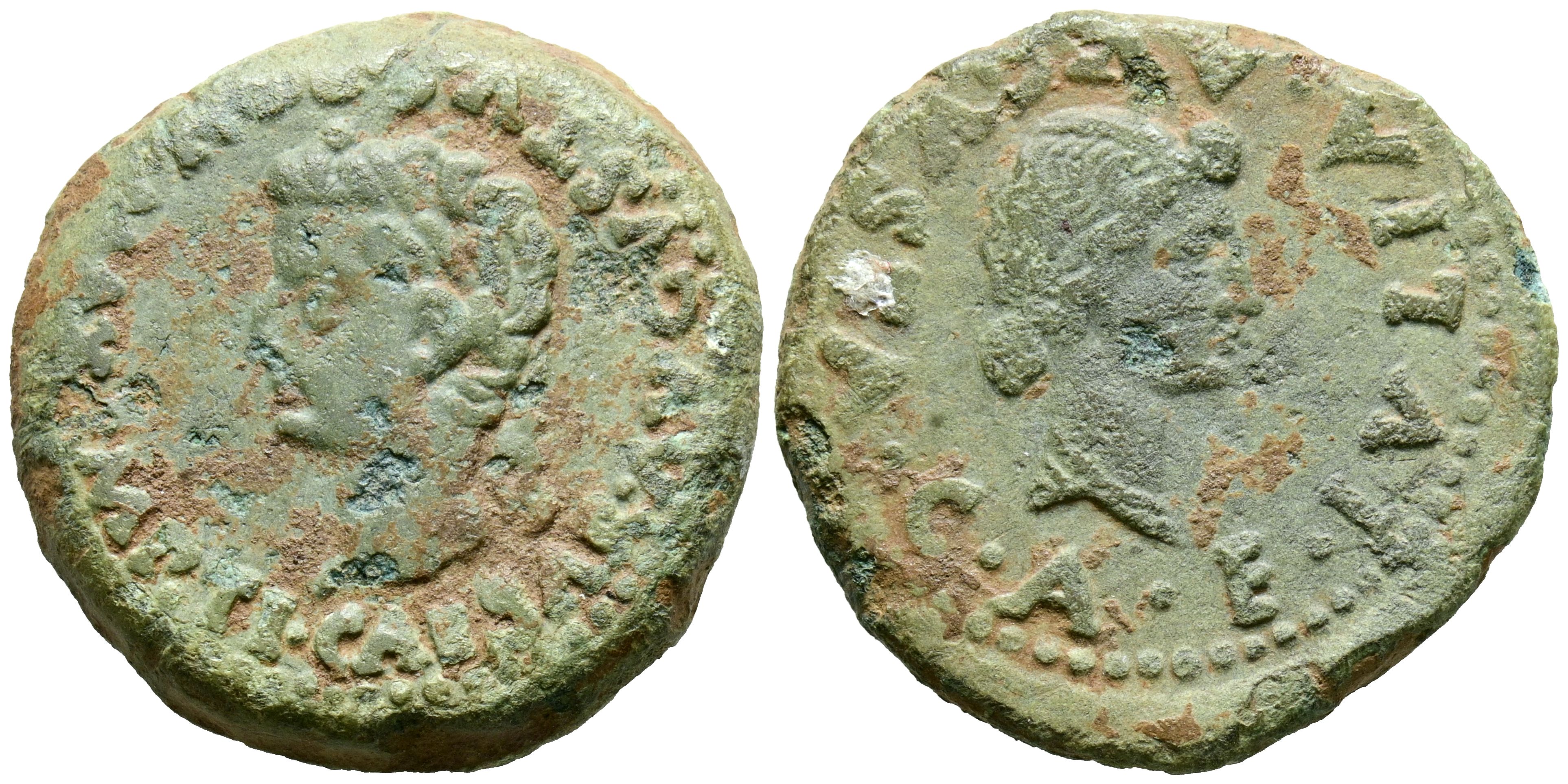 EMERITA AUGUSTA (Mérida, Badajoz). As. (Ae. 12,35g/27mm). 14-36 d.C. (FAB-1053). Anv: Cabeza laureada de Tiberio a izquierda, alrededor leyenda: TI CAESAR AVGVSTVS PONT MAX. Rev: Cabeza de Livia a derecha, alrededor leyenda: IVLIA AVGVSTA CAE. MBC+.