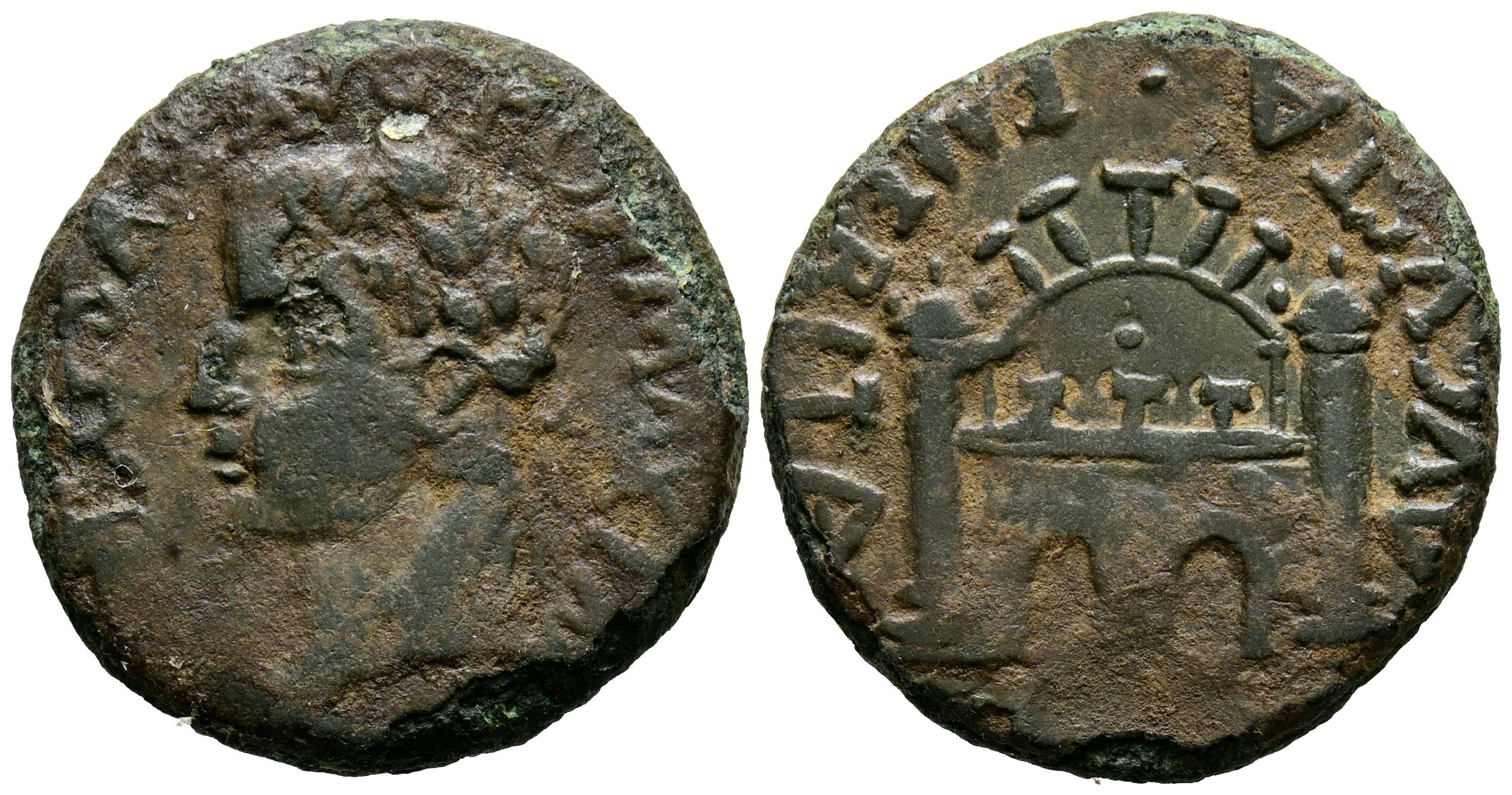 EMERITA AUGUSTA (Mérida, Badajoz). As. (Ae. 6,69g/23mm). 14-36 d.C. (FAB-1055) Anv: Cabeza desnuda de Tiberio a izquierda, alrededor leyenda: TI CAESAR AVG PON MAX IMP. Rev: Puerta de la ciudad, alrededor leyenda: COL AVGVSTA EMERITA. MBC-/MBC.