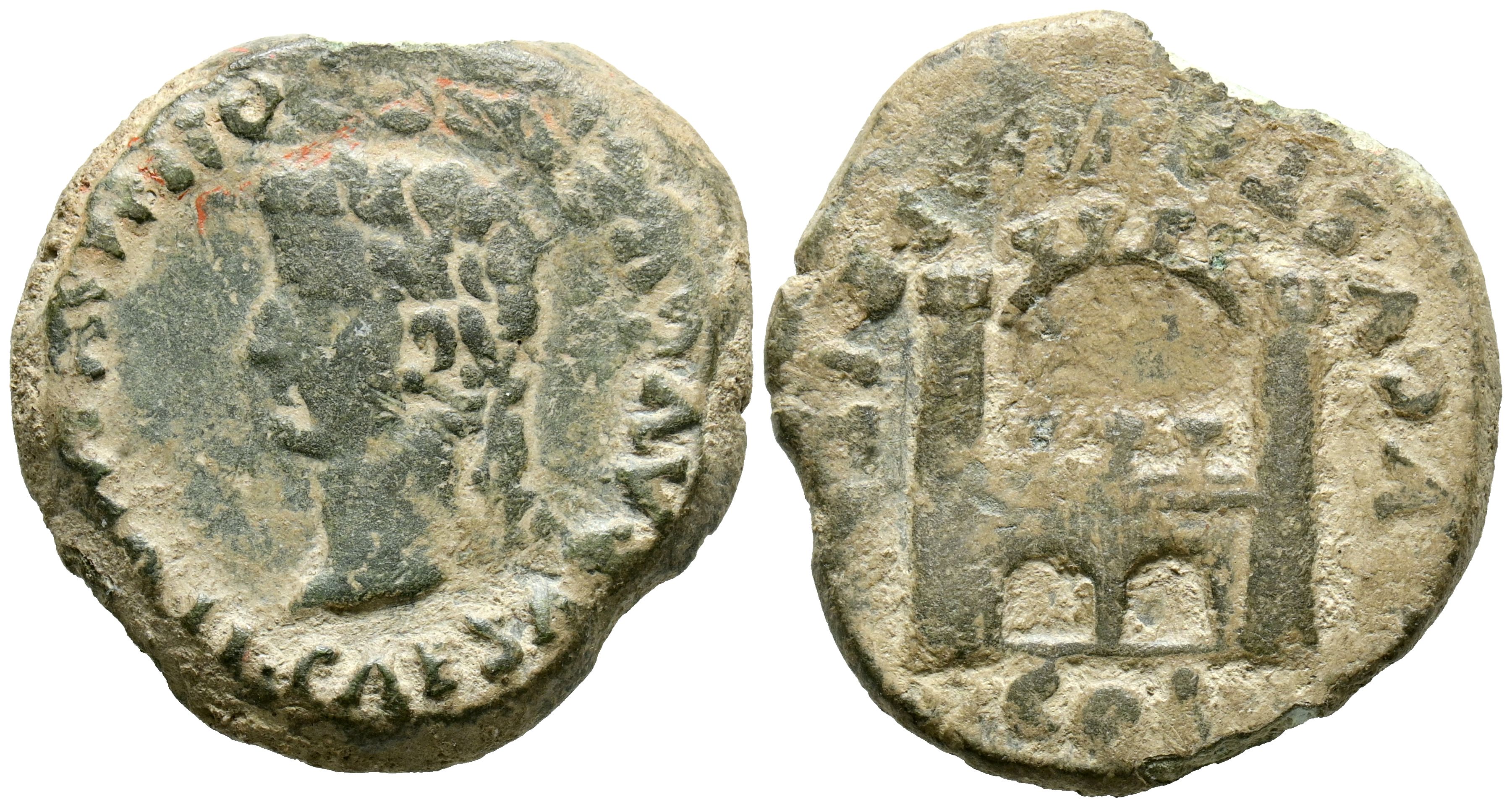 EMERITA AUGUSTA (Mérida, Badajoz). As. (Ae. 9,35g/26mm). 14-36 d.C. (FAB-1056). Anv: Cabeza laureada de Augusto a izquierda, alrededor leyenda: TI CAESAR AVGVSTVS PON MAX IMP. Rev: Puerta de la ciudad, alrededor leyenda: COL AVGVSTA EMERITA. MBC-.