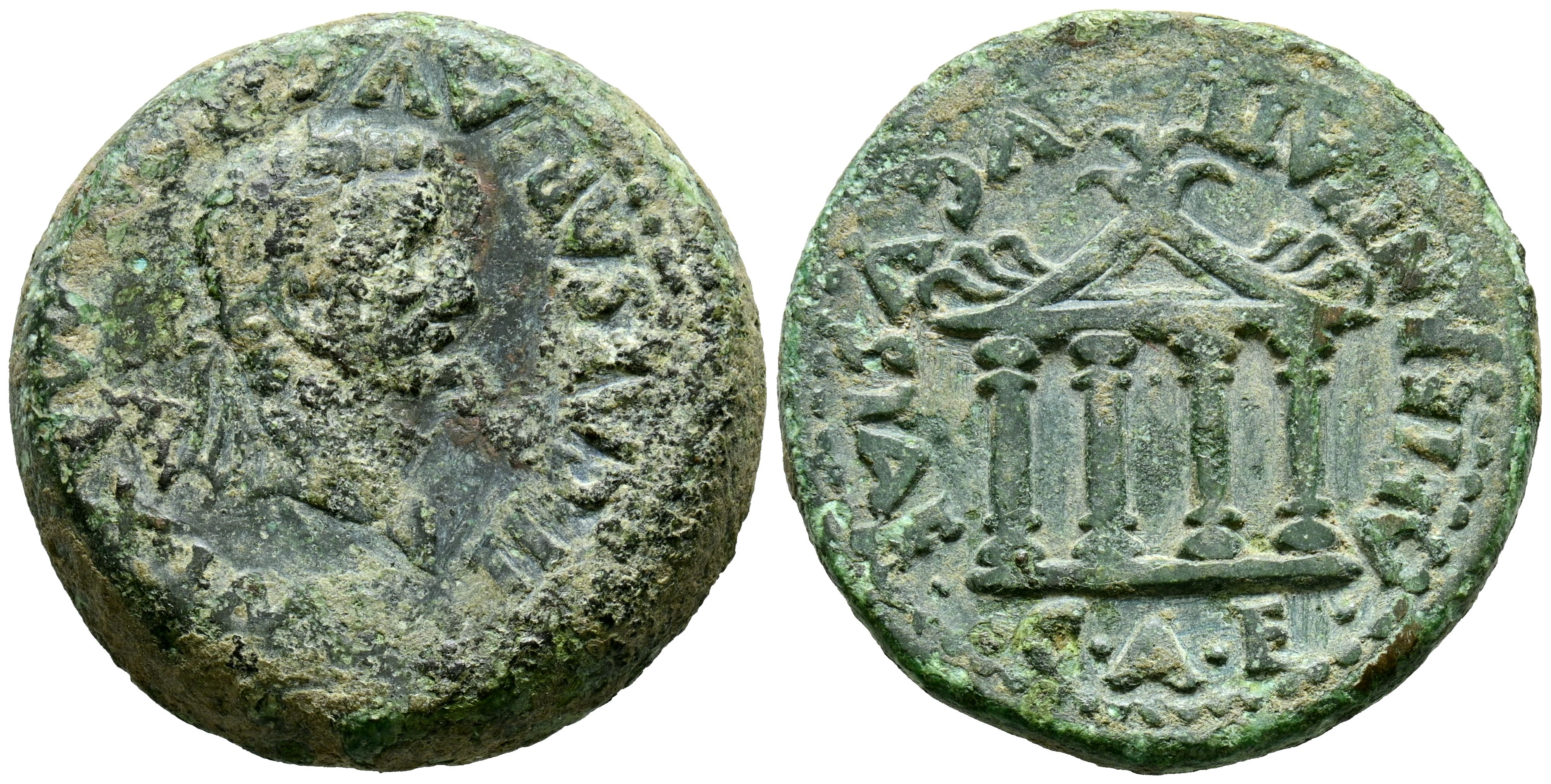 EMERITA AUGUSTA (Mérida, Badajoz). As. (Ae. 17,69g/28mm). 14-36 d.C. (FAB-1062). Anv: Cabeza laureada de Tiberio a derecha, alrededor leyenda: TI CAESAR AVG PONT MAX IMP. Rev: Templo tetrástilo, alrededor leyenda: AETERNITATI AVGVSTAE CAE. MBC.