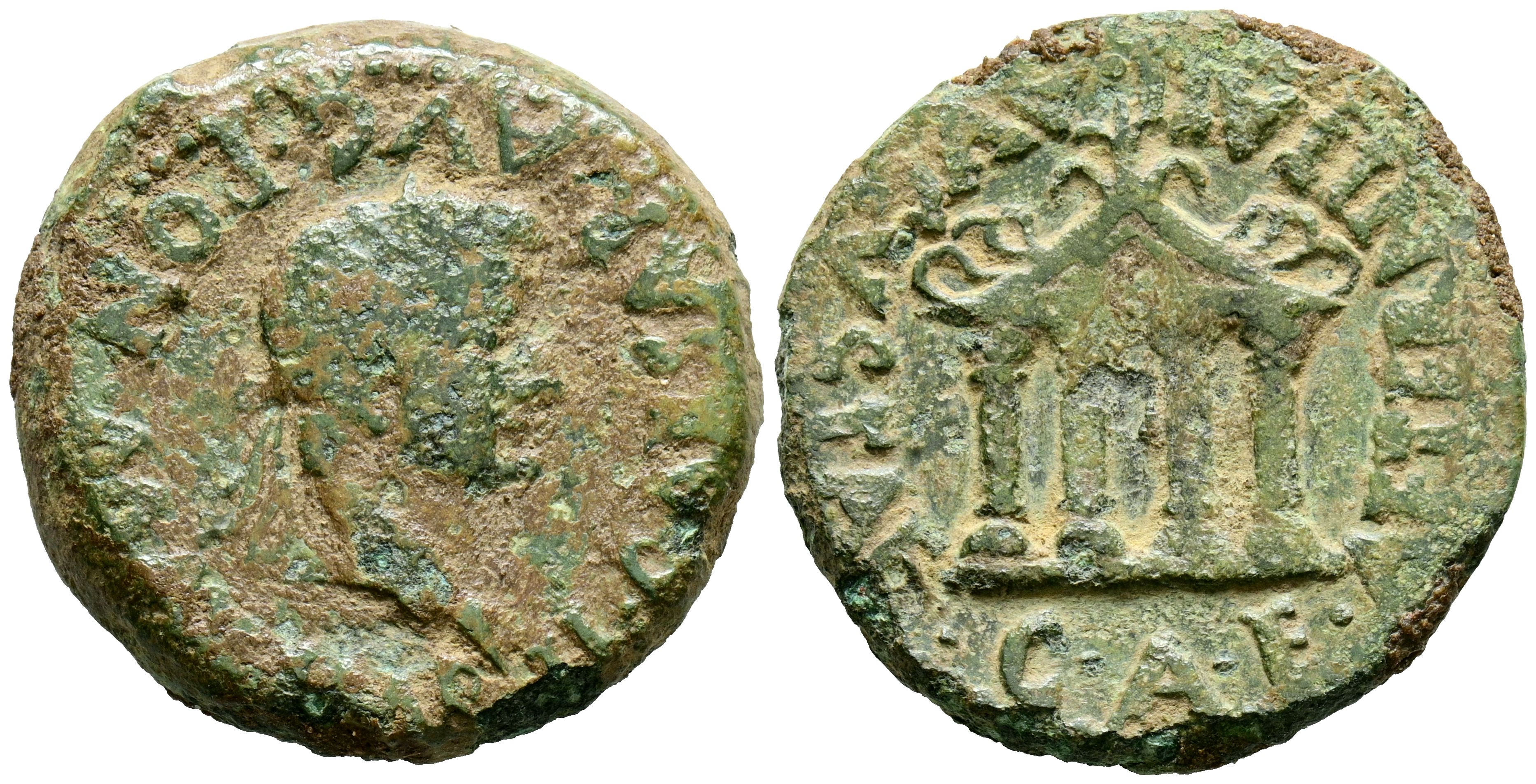 EMERITA AUGUSTA (Mérida, Badajoz). As. (Ae. 11,32g/27mm). 14-36 d.C. (FAB-1062). Anv: Cabeza laureada de Tiberio a derecha, alrededor leyenda: TI CAESAR AVG PONT MAX IMP. Rev: Templo tetrástilo, alrededor leyenda: AETERNITATI AVGVSTAE CAE. MBC-/MBC.