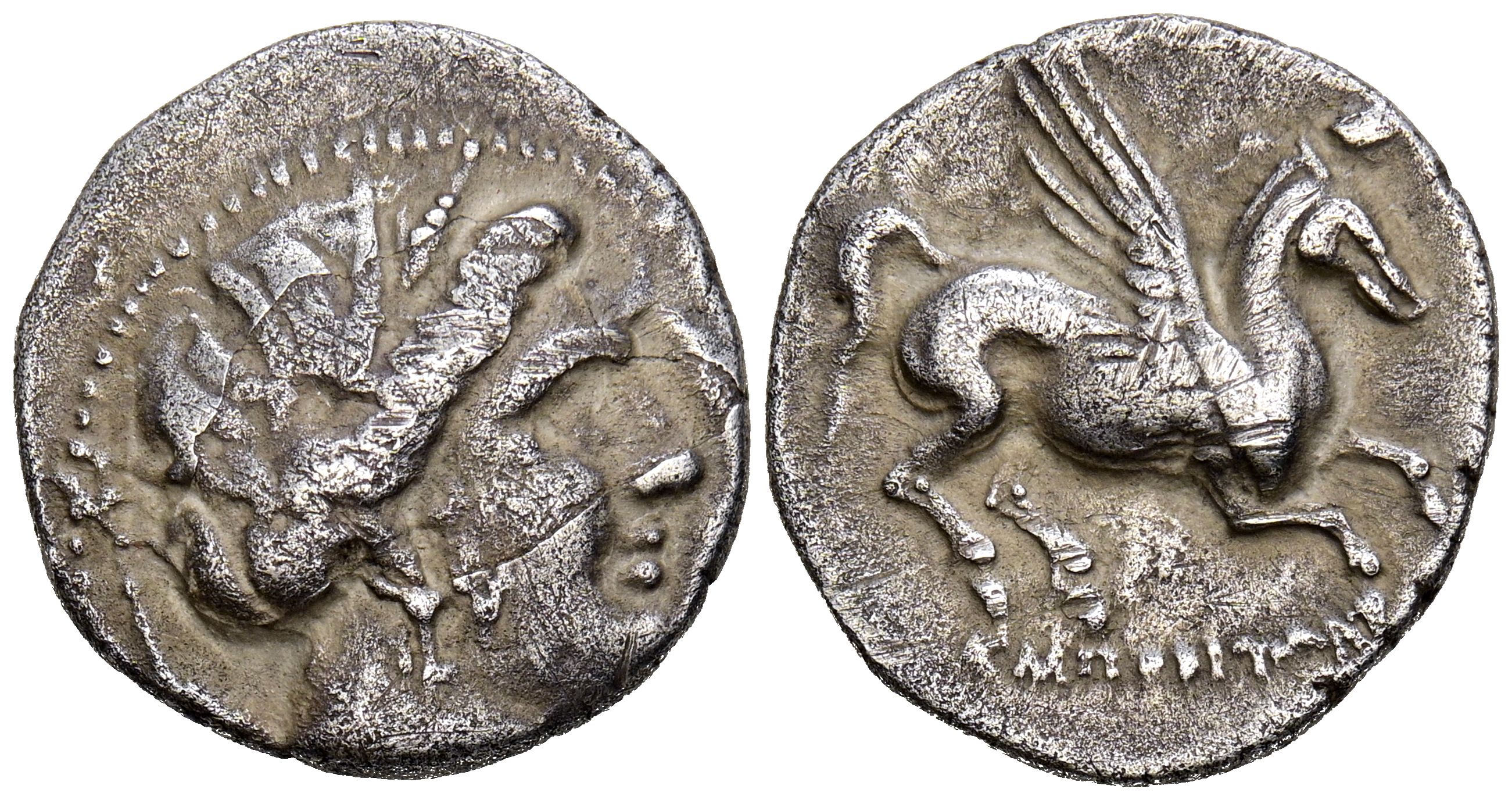 EMPORION (Ampurias, Gerona). Dracma. (Ar. 4,57g/18mm). 220-150 a.C. (FAB-1108). Anv: Cabeza diademada de Persefoné-Aretusa a derecha, alrededor tres delfines. Rev: Pegaso-Criasor a derecha, debajo leyenda griega. MBC. Escaso.