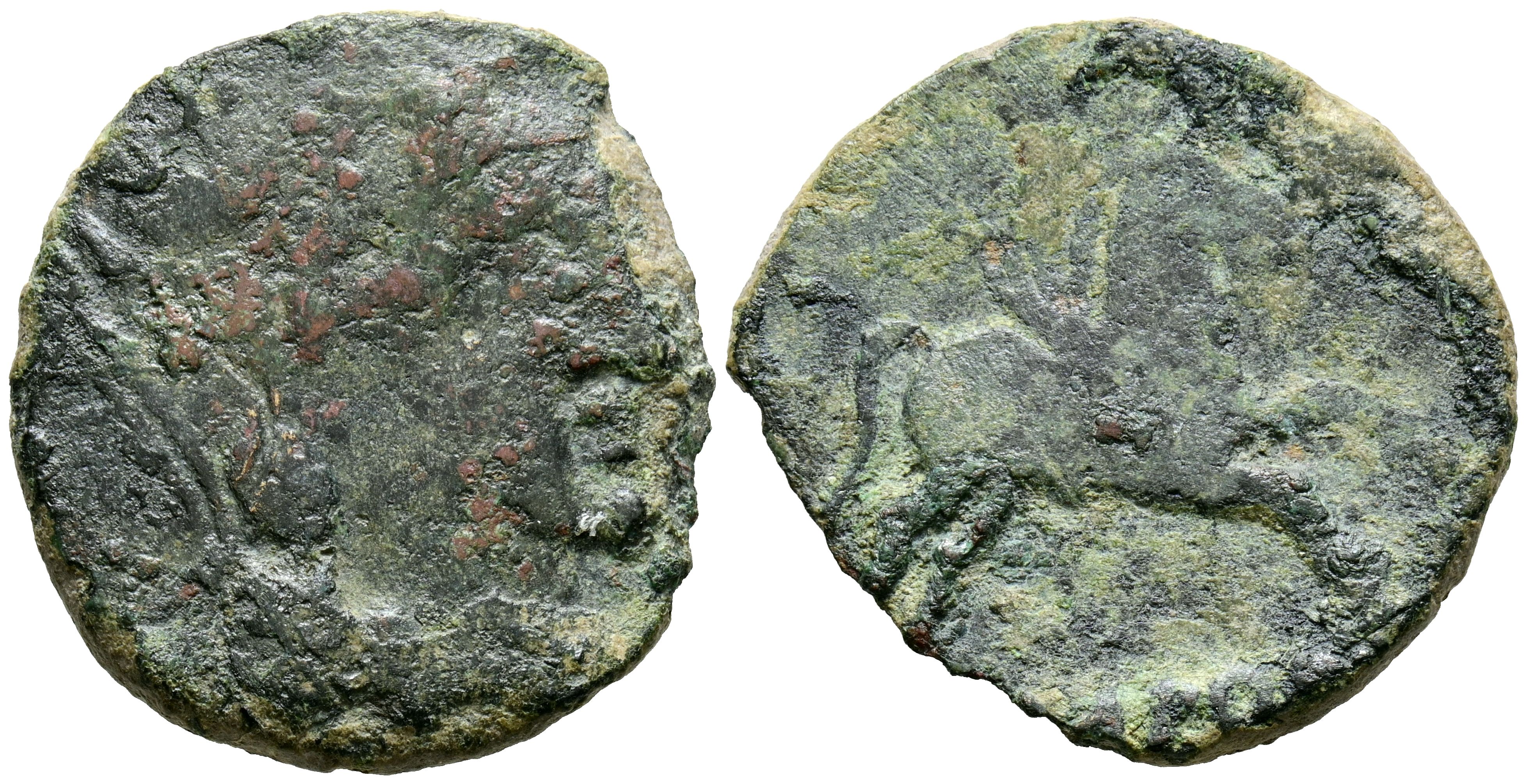 EMPORION (Ampurias, Gerona). As. (Ae. 10,63g/29mm). 50-27 a.C. (FAB-1246). Anv: Cabeza de Palas con casco a derecha. Rev: Pegaso a derecha, encima corona de laurel, debajo leyenda: EMPORI. BC-. Falta de cospel.